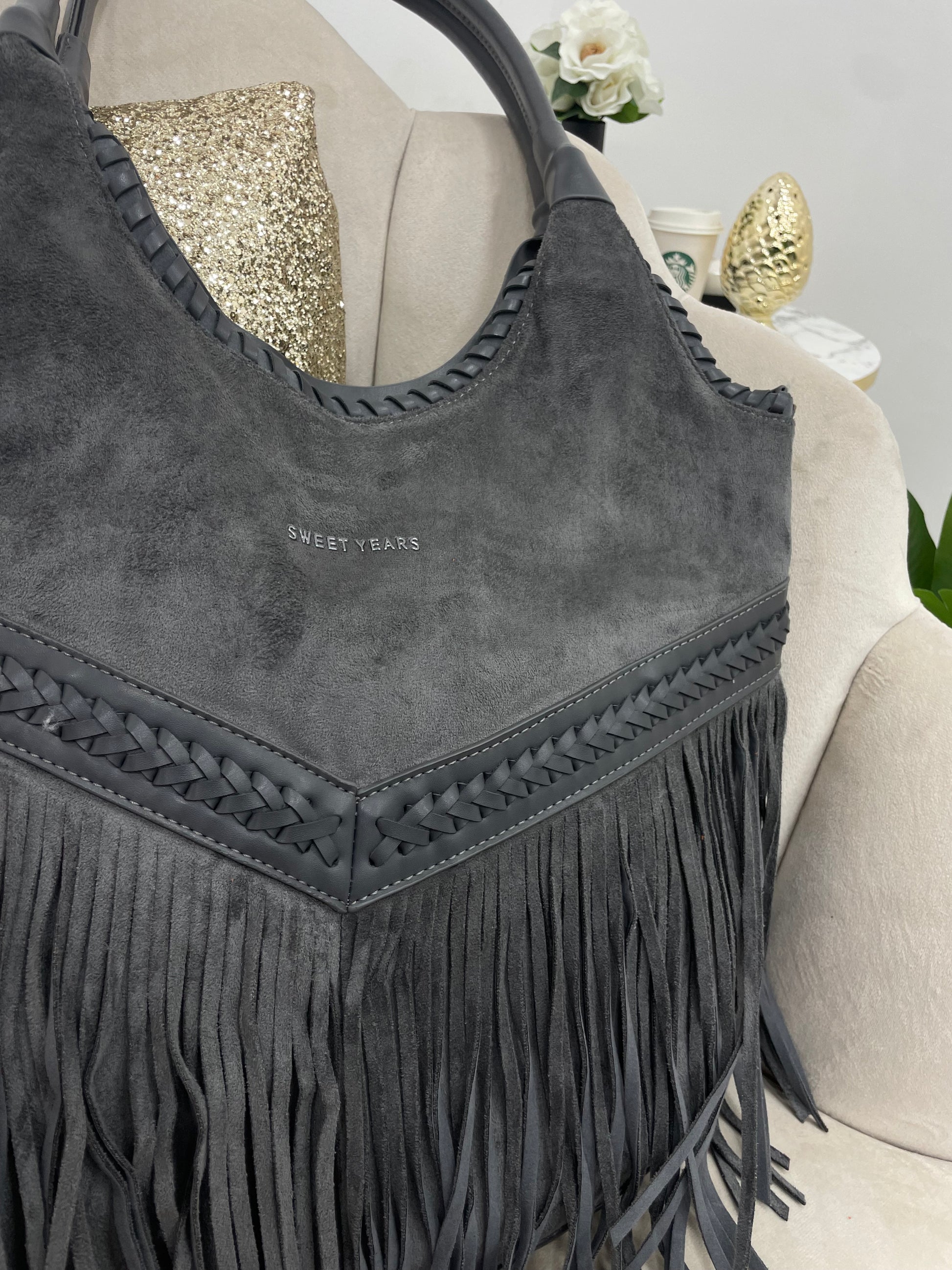 Borsa a spalla con chiusura a zip, scamosciata, con frange e dettagli in ecopelle intrecciati, tasche interne e una tasca esterna.