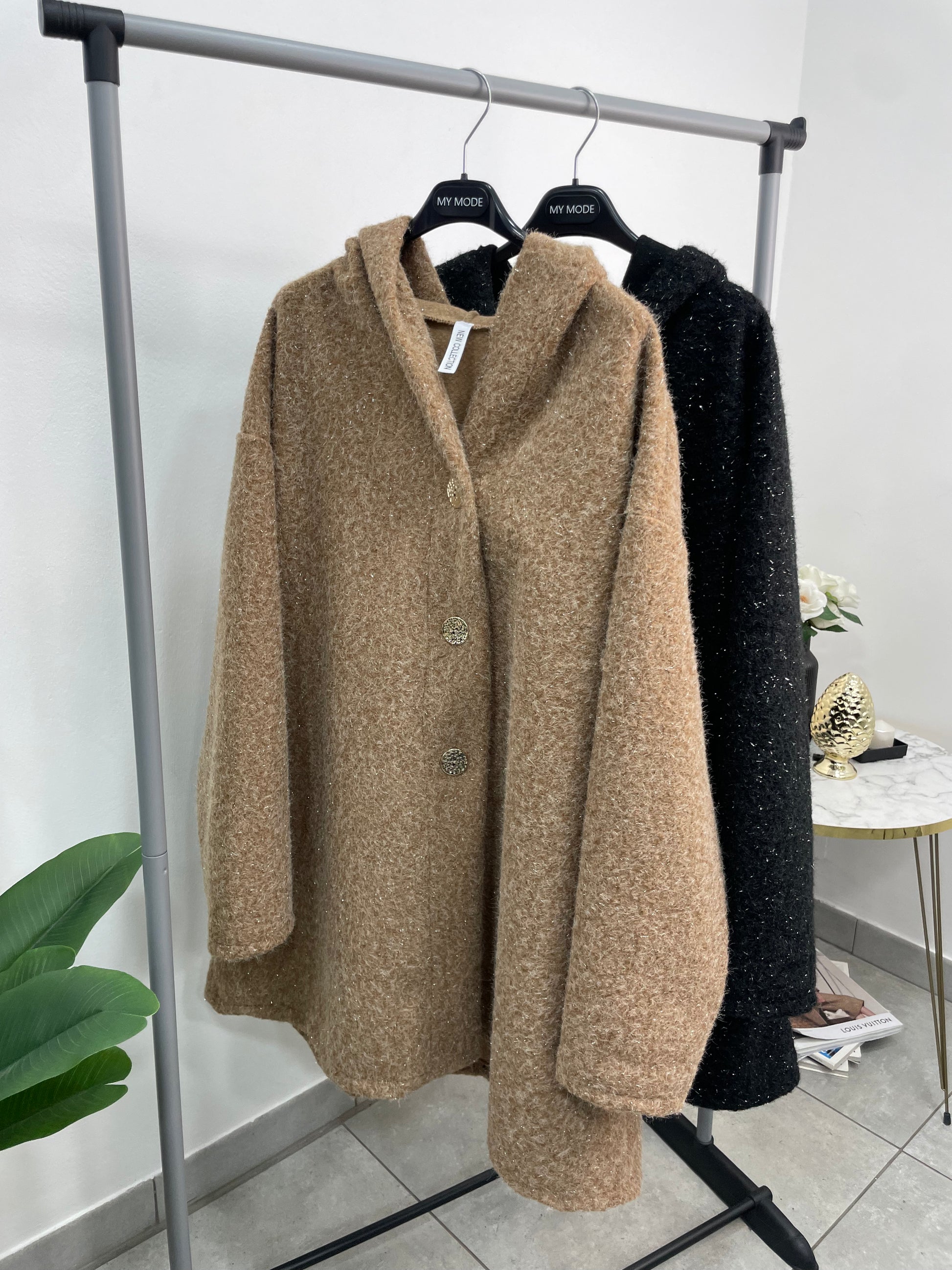 Cappotto over in bouclé con fili lurex, dettaglio bottoni in oro, cappuccio e tasche.