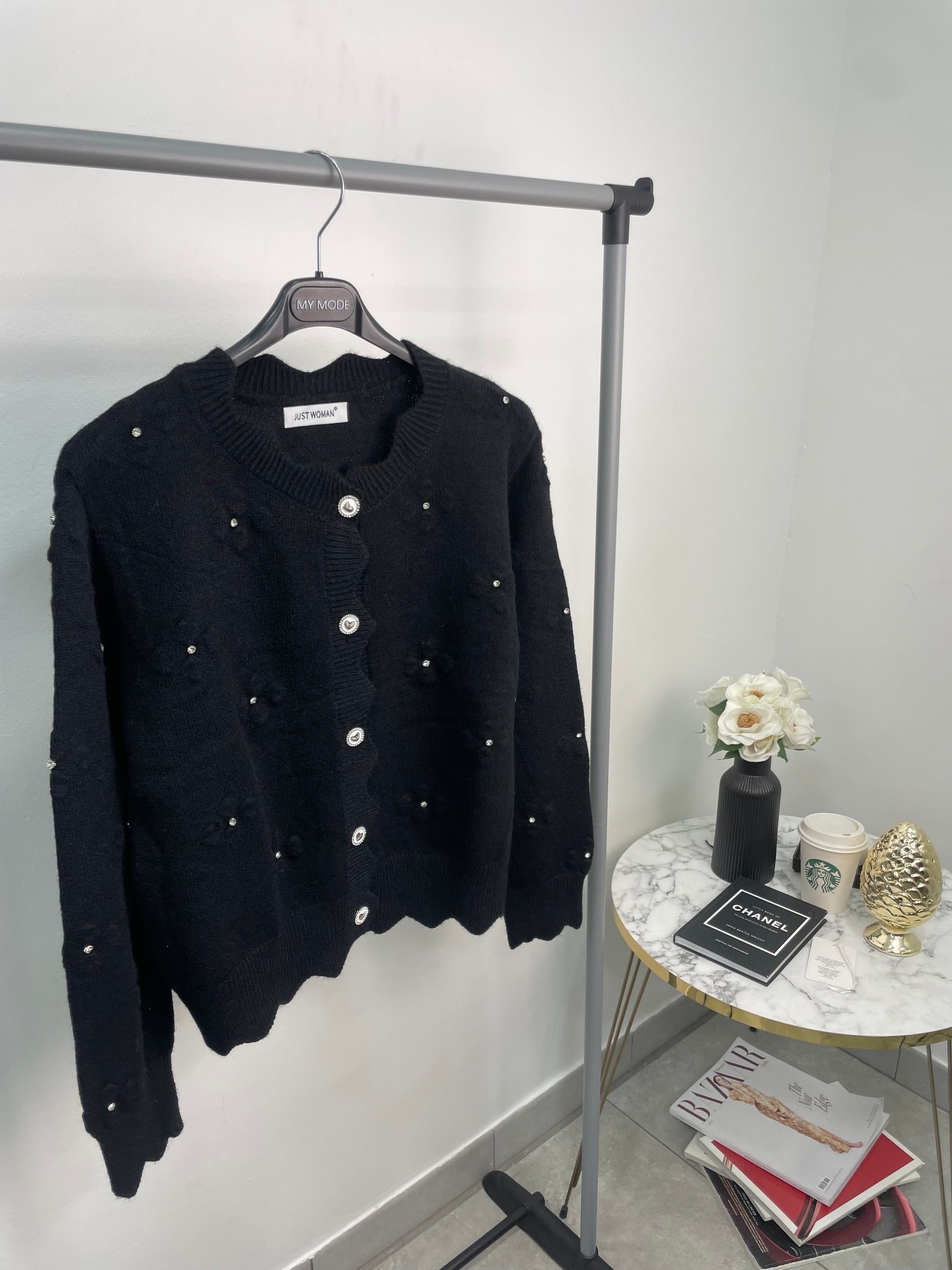 Cardigan con strass, bottoni gioiello, colletto, polsini e fondo ondulati.