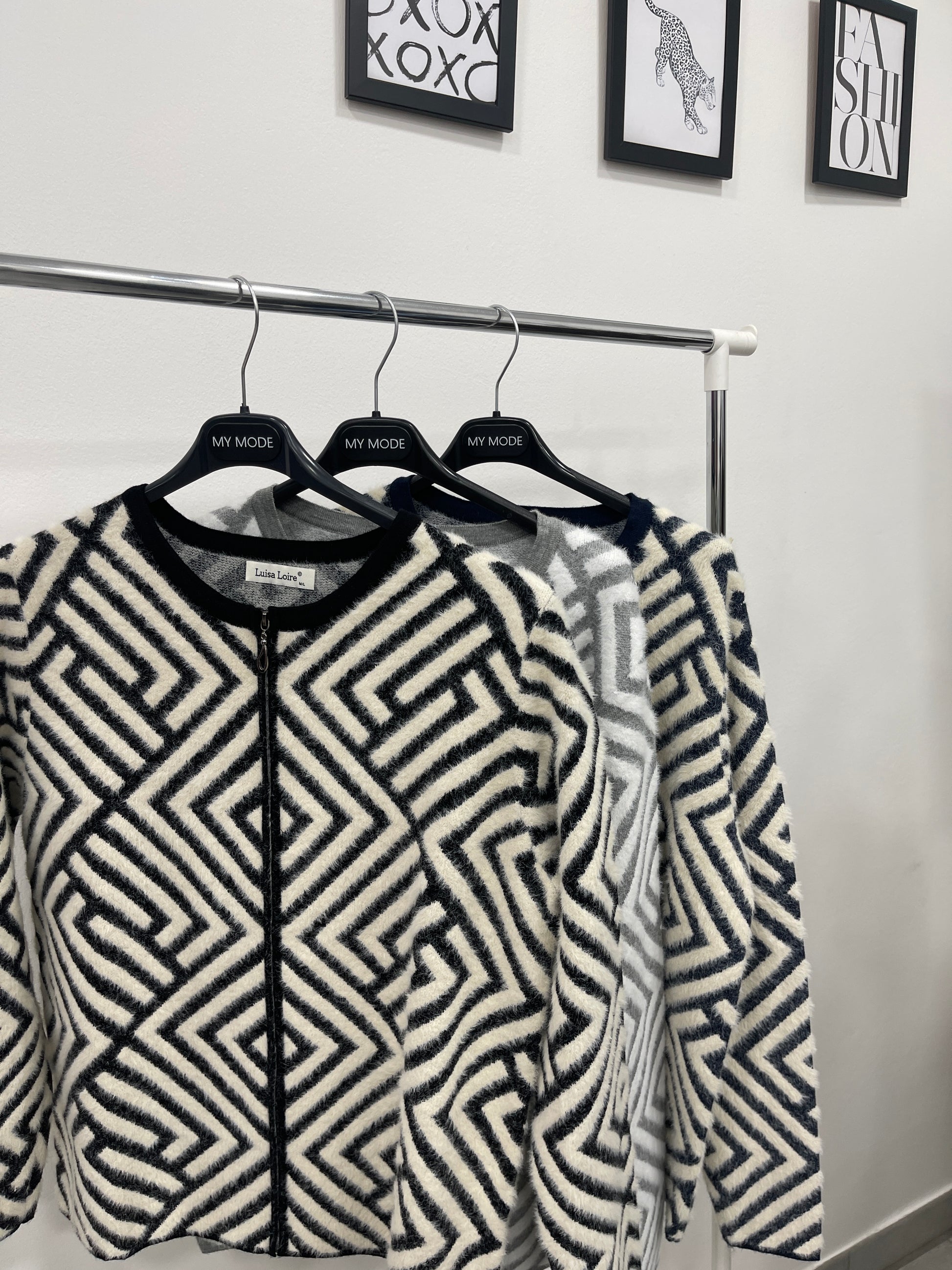Cardigan con fantasia a rombi, girocollo e chiusura a zip.