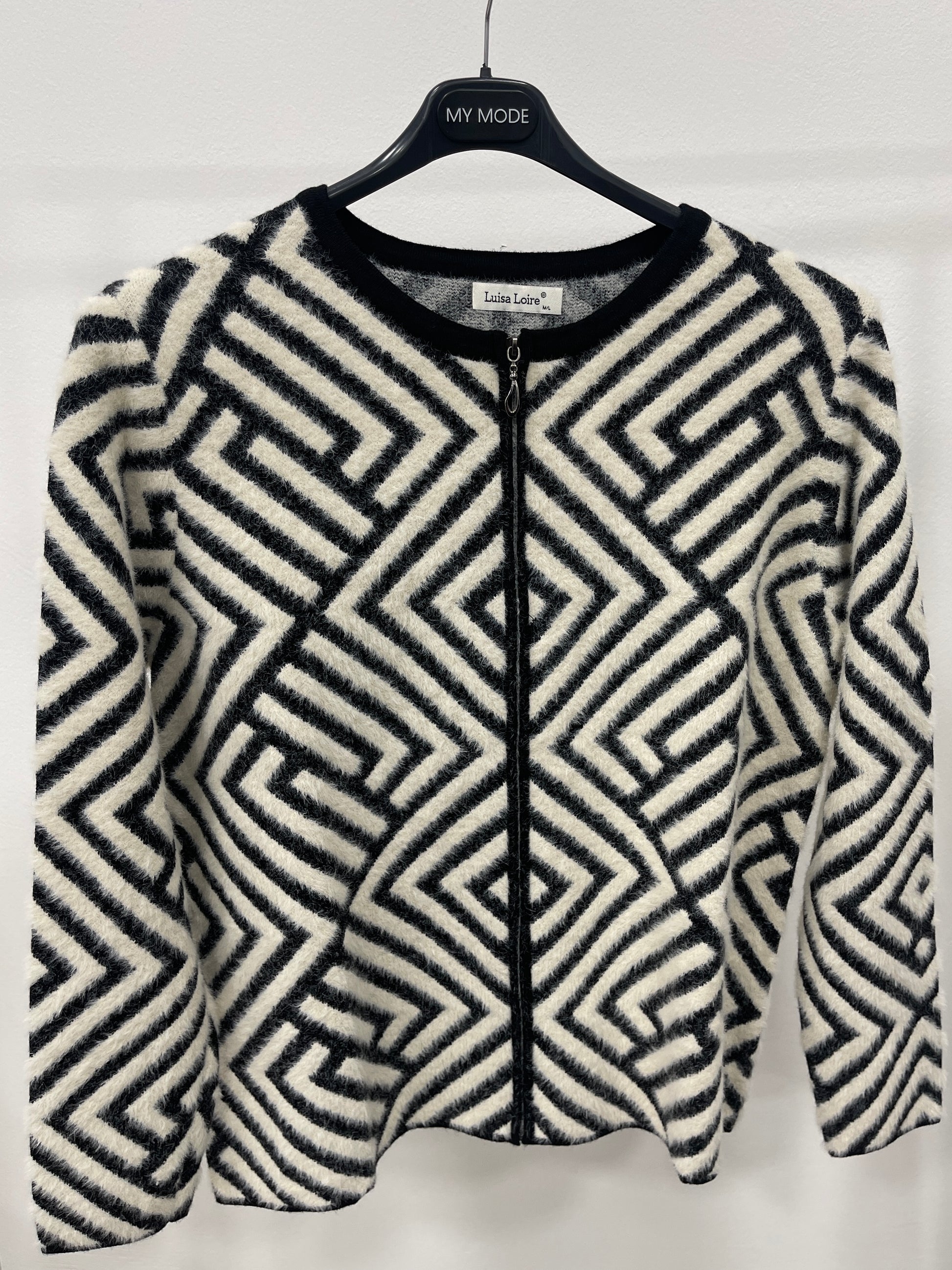 Cardigan con fantasia a rombi, girocollo e chiusura a zip.