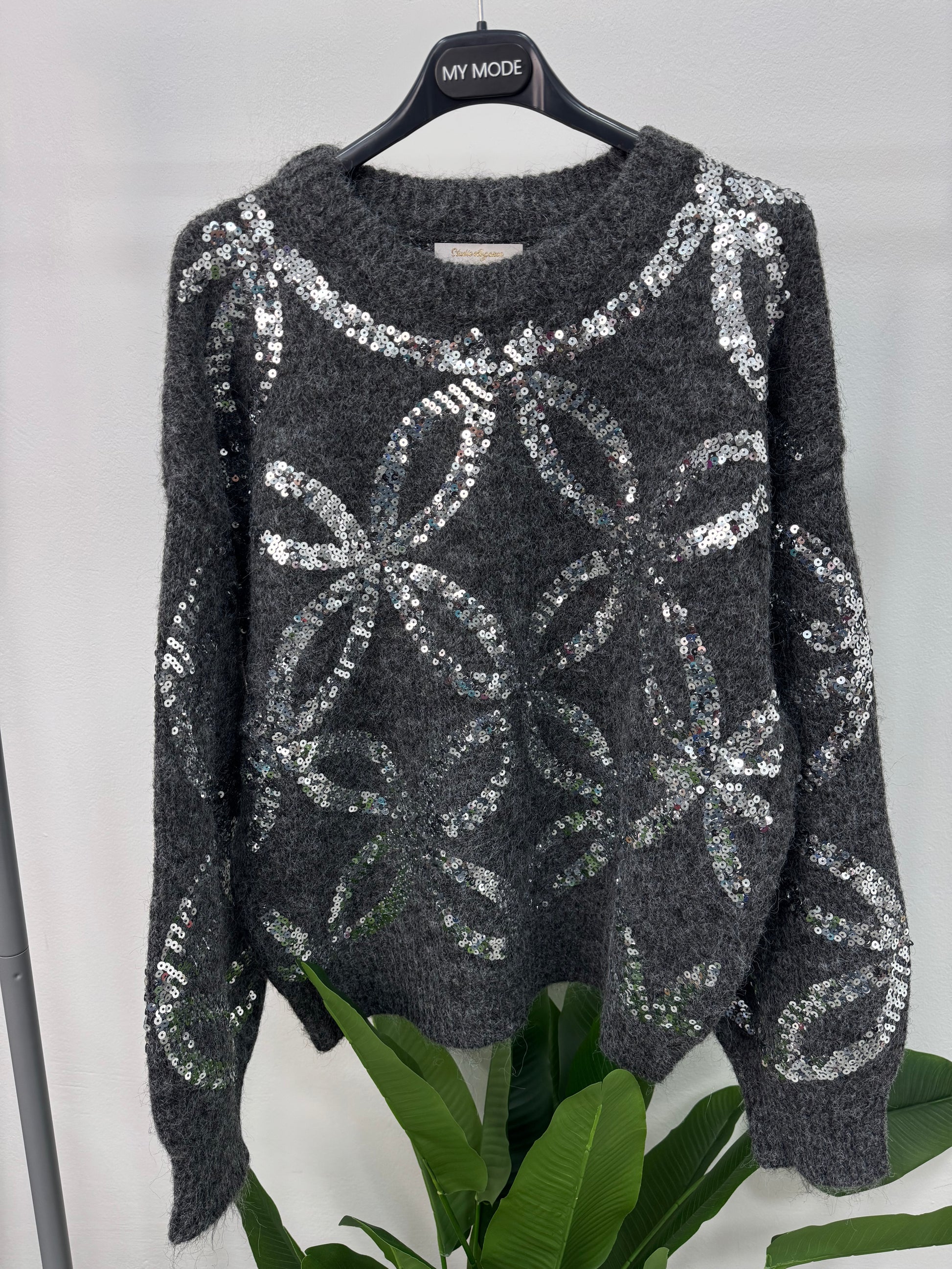 Maglione girocollo con elastico in vita e sui polsini e paillettes argento sul davanti.