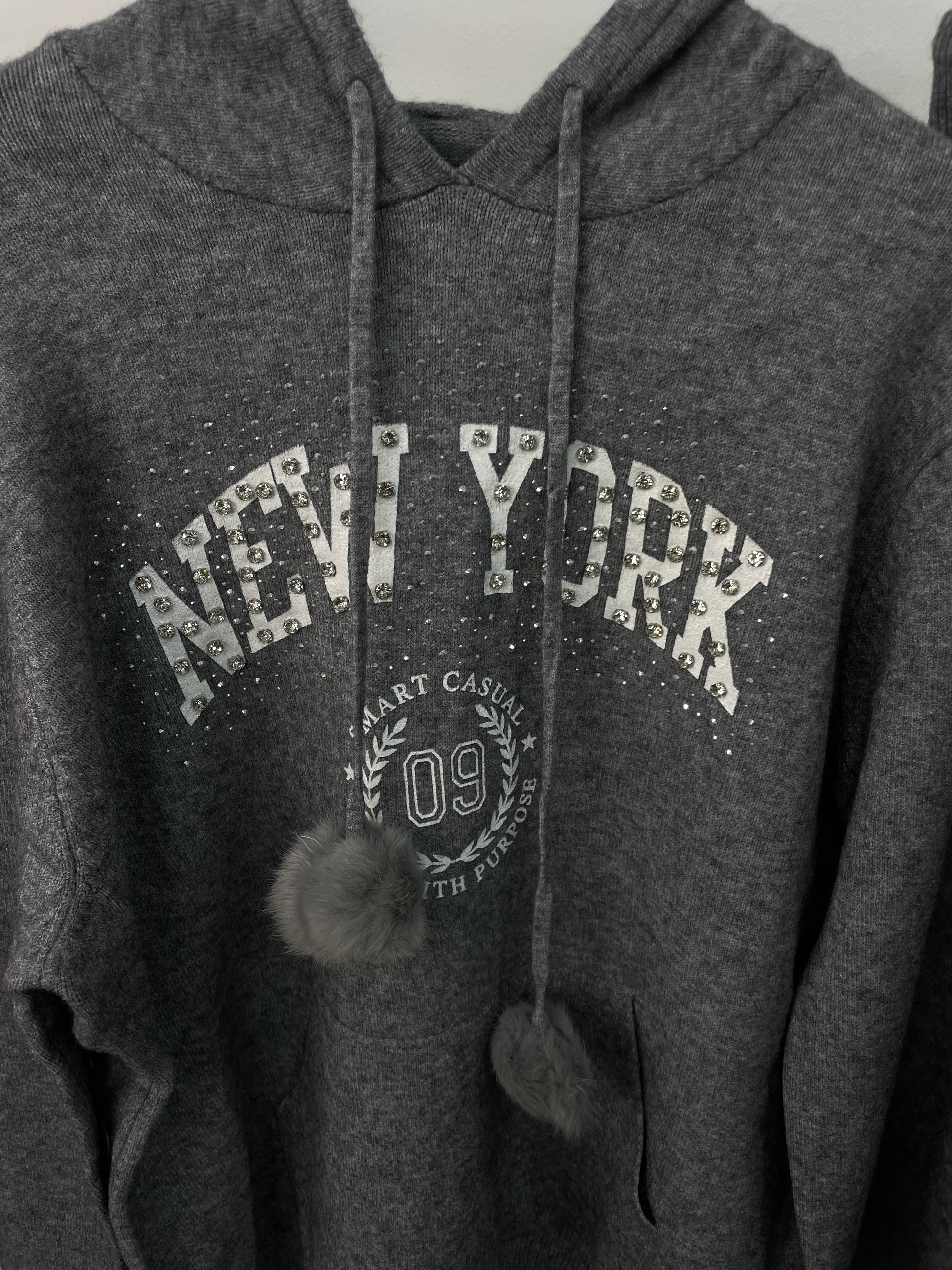 Completo con Pantalone palazzo con elastico e lacci in vita e maglia con scritta, strass, lacci con pon pon, tasca e cappuccio.