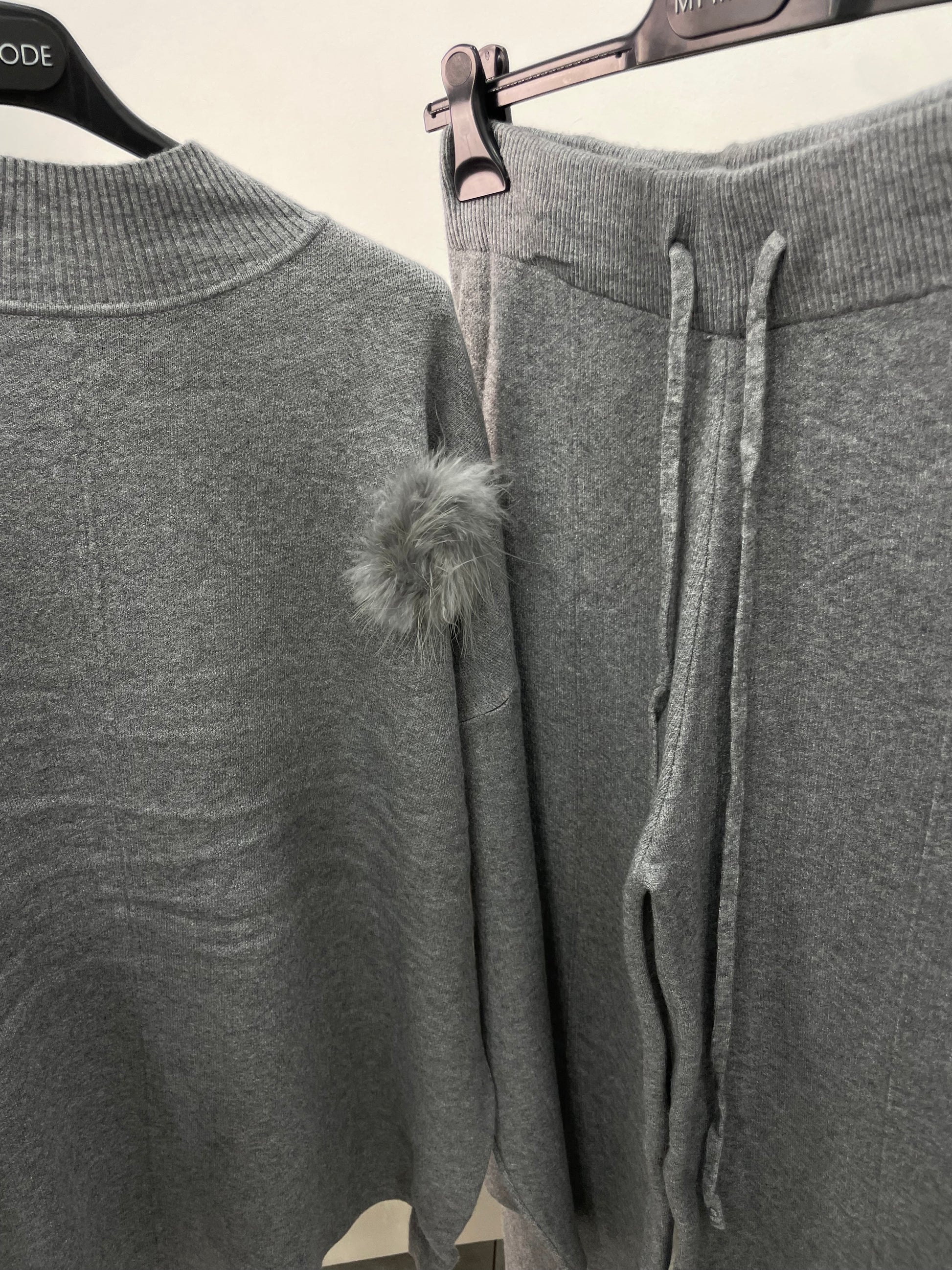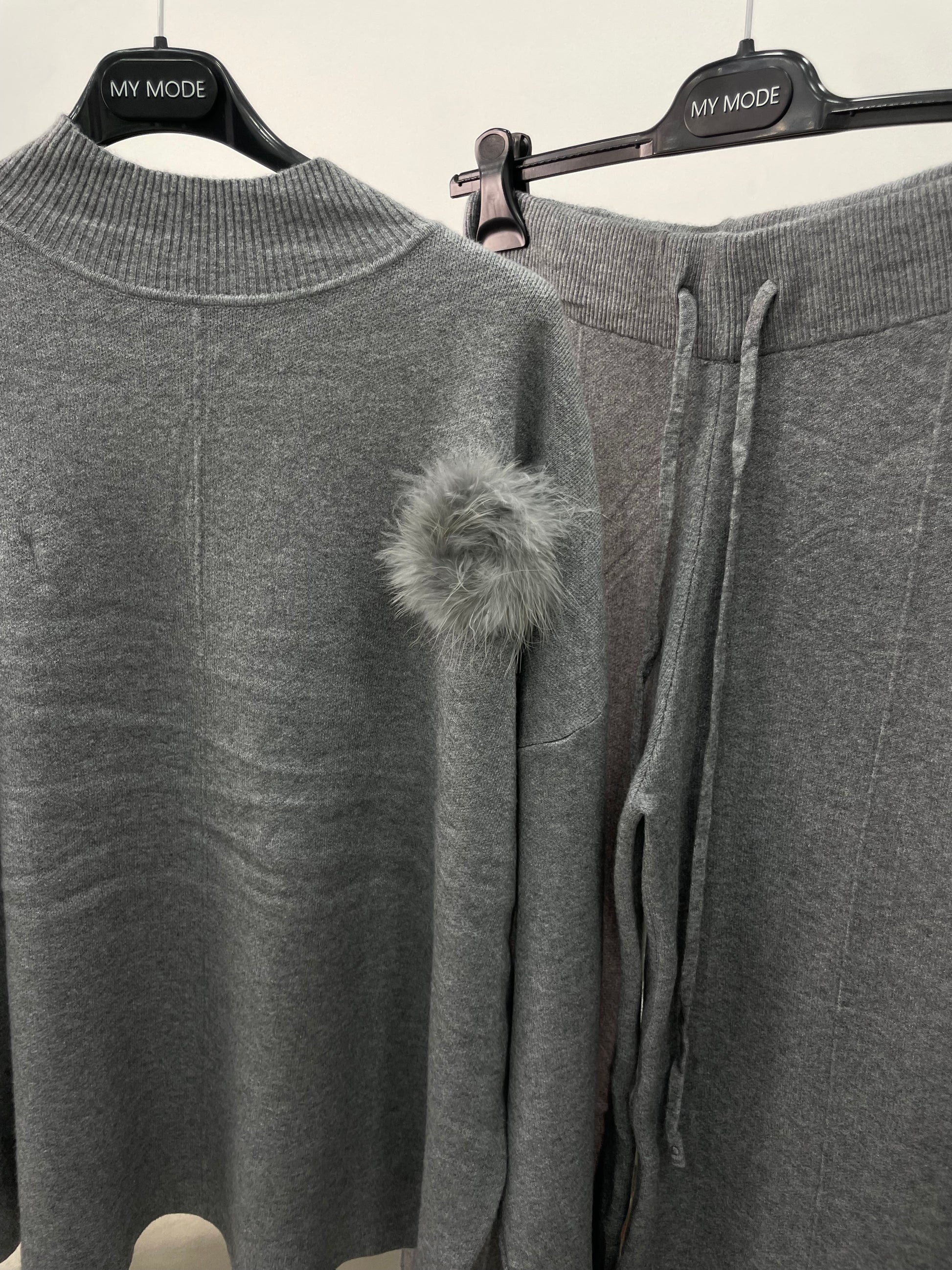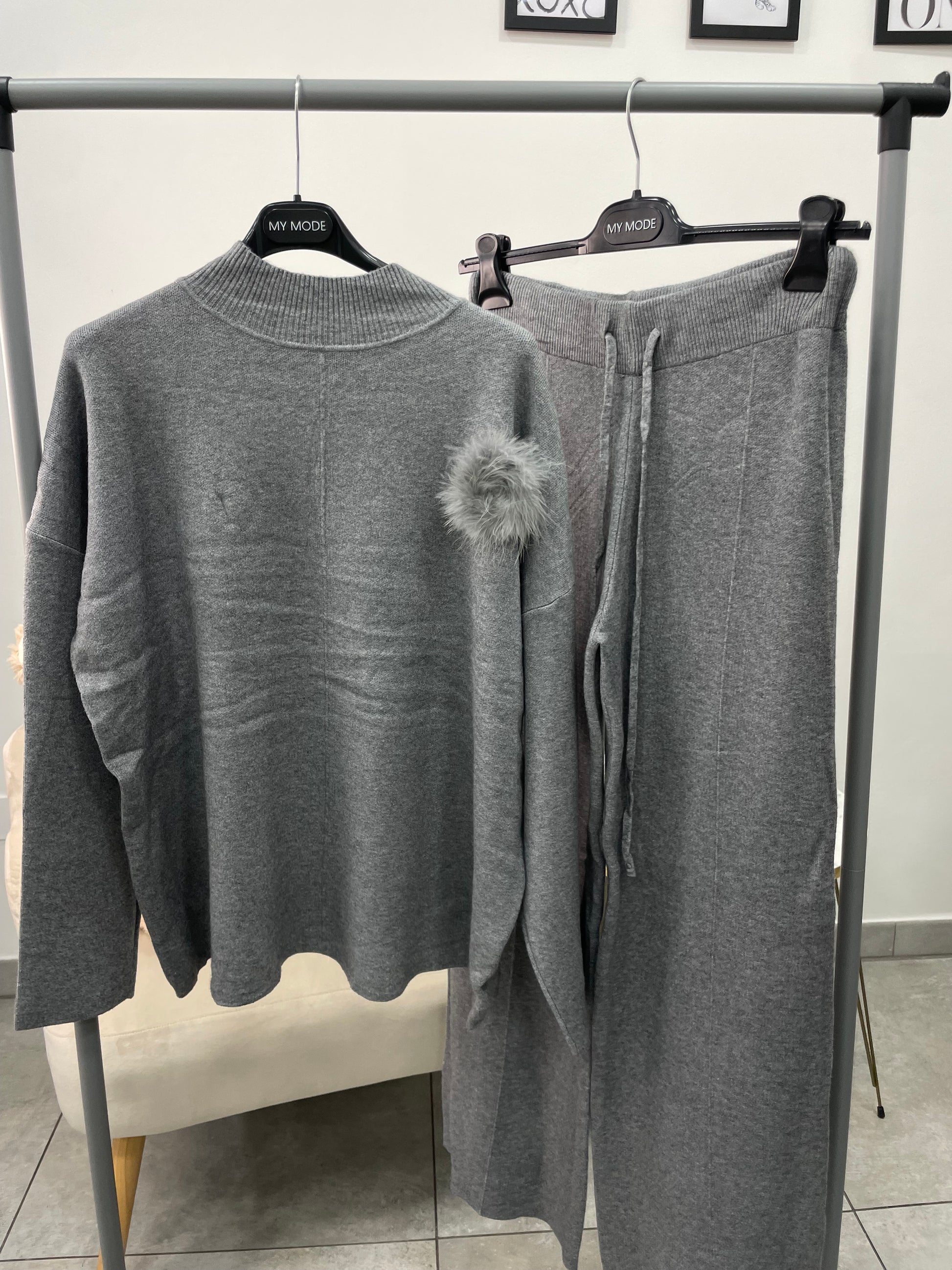 Completo con Pantalone palazzo con elastico e lacci in vita e maglia con collo lupetto e spilla rimovibile.
