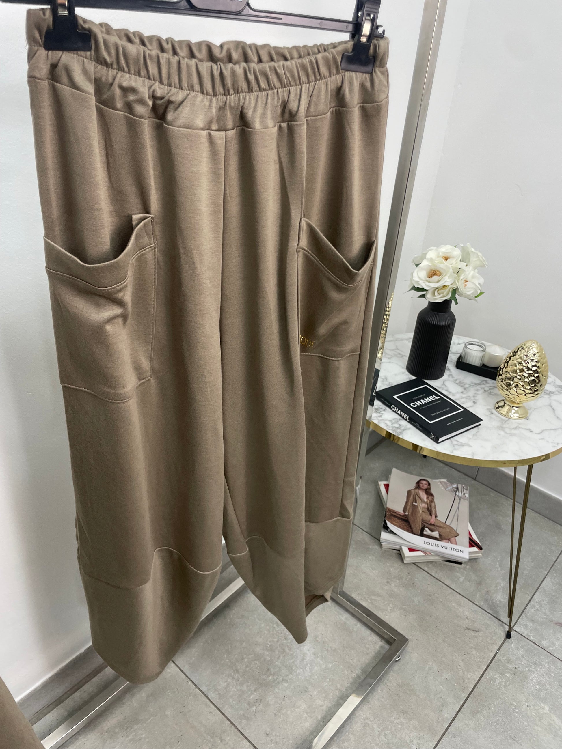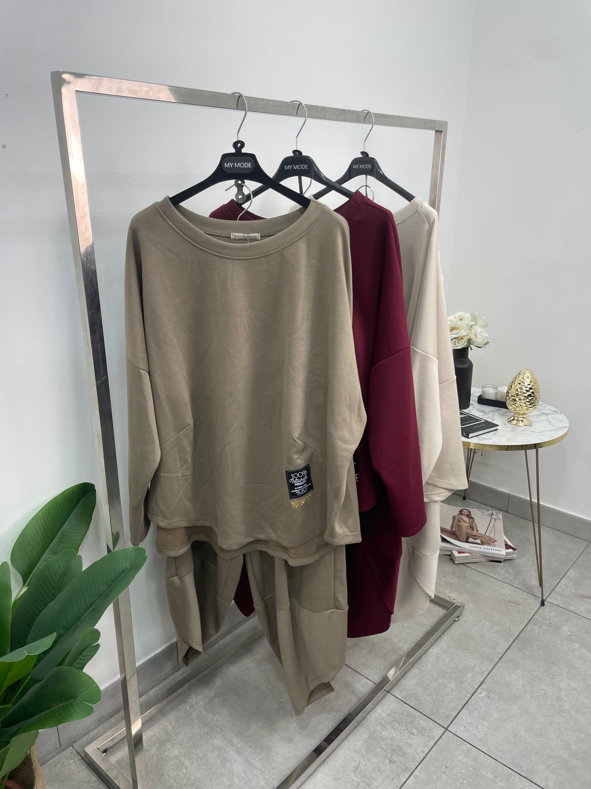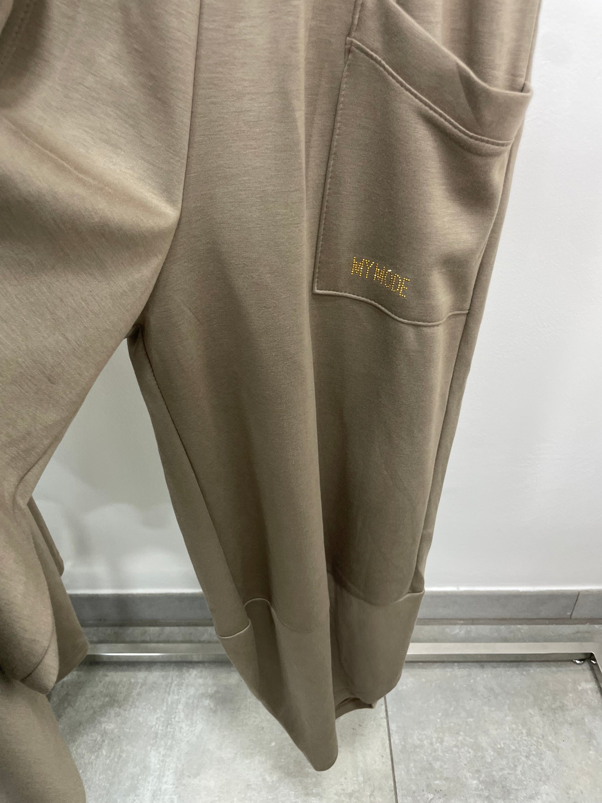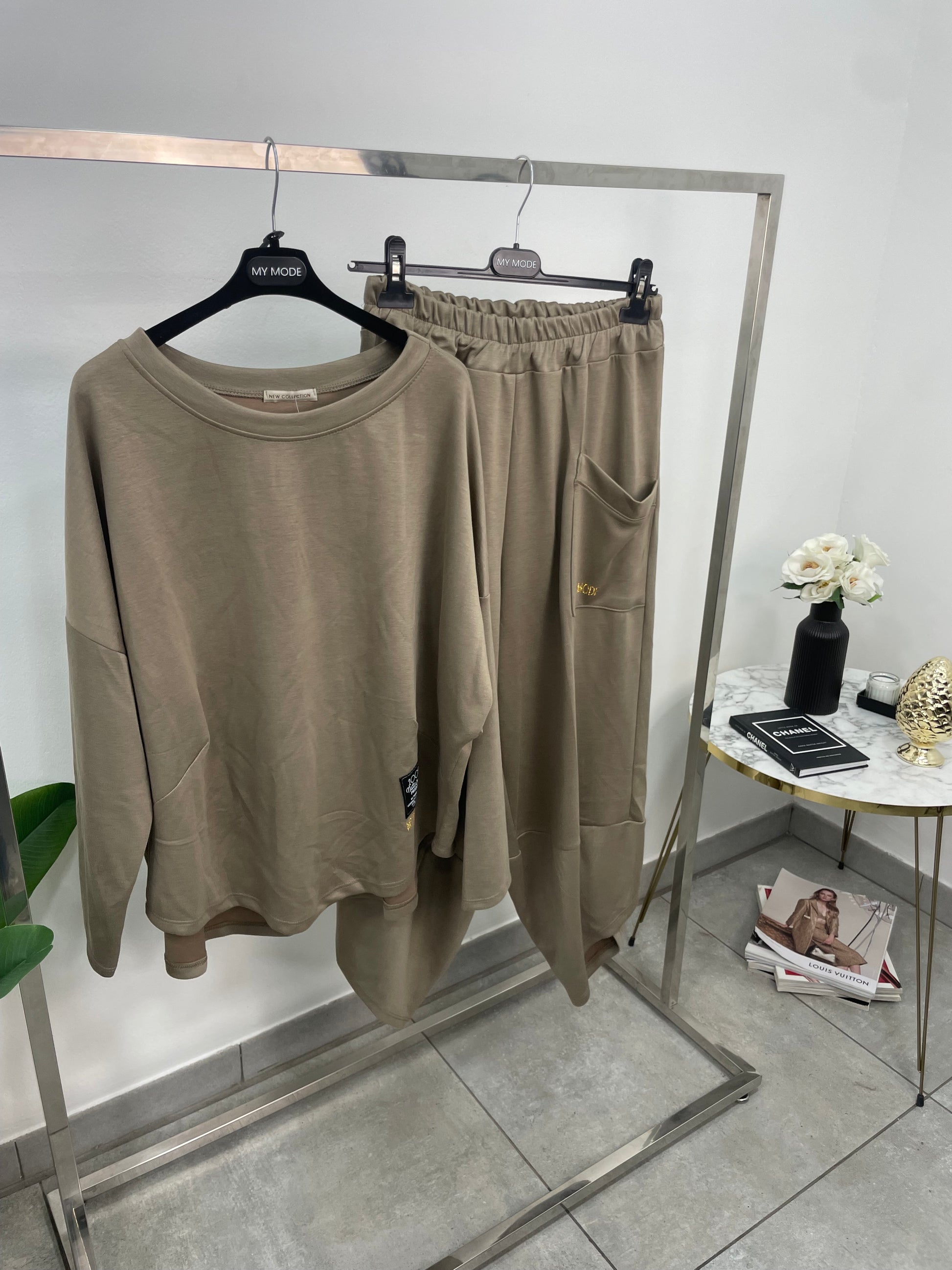 Coordinato tuta over con logo “MY MODE”, pantalone asimmetrico con tasche davanti