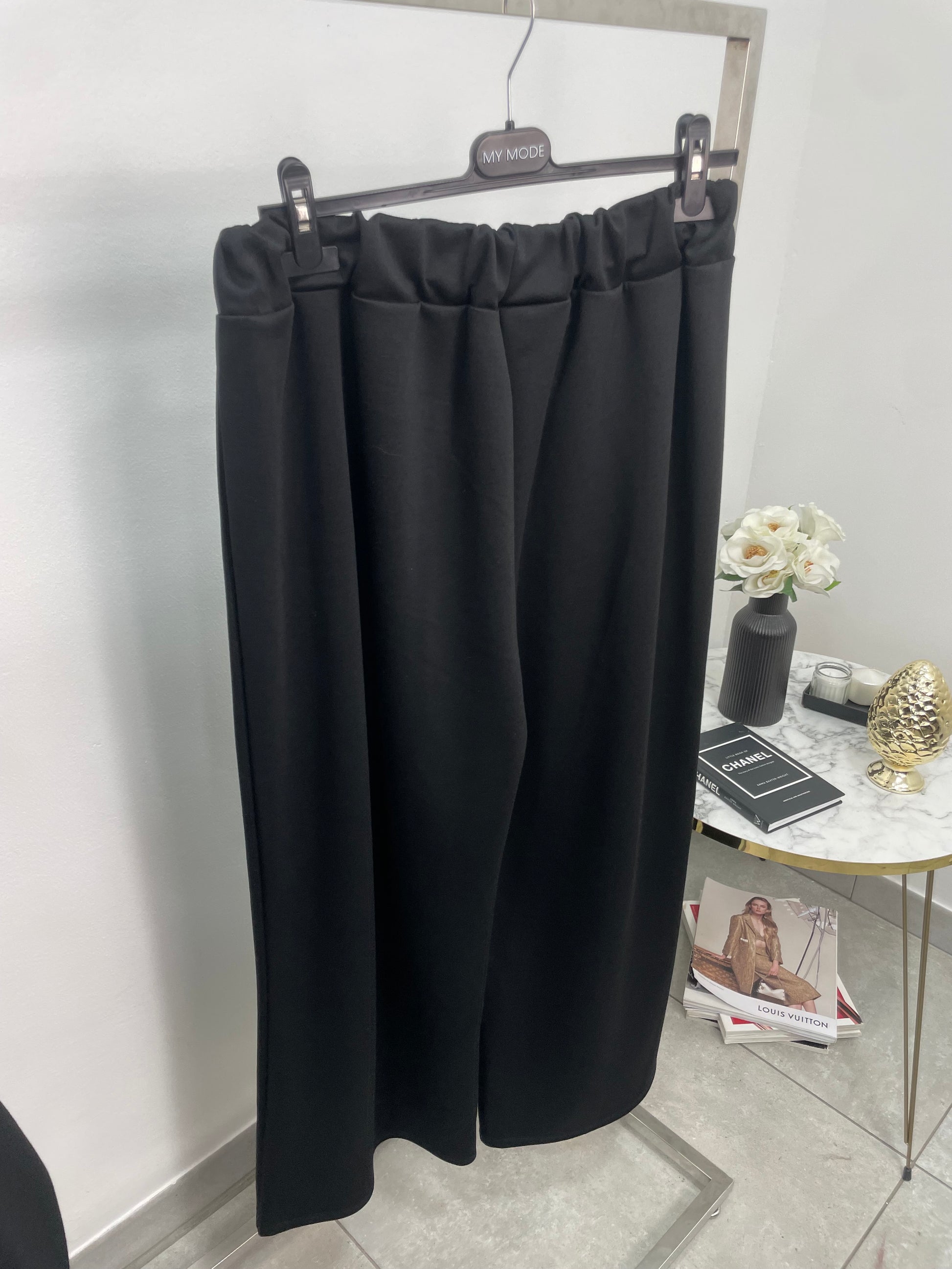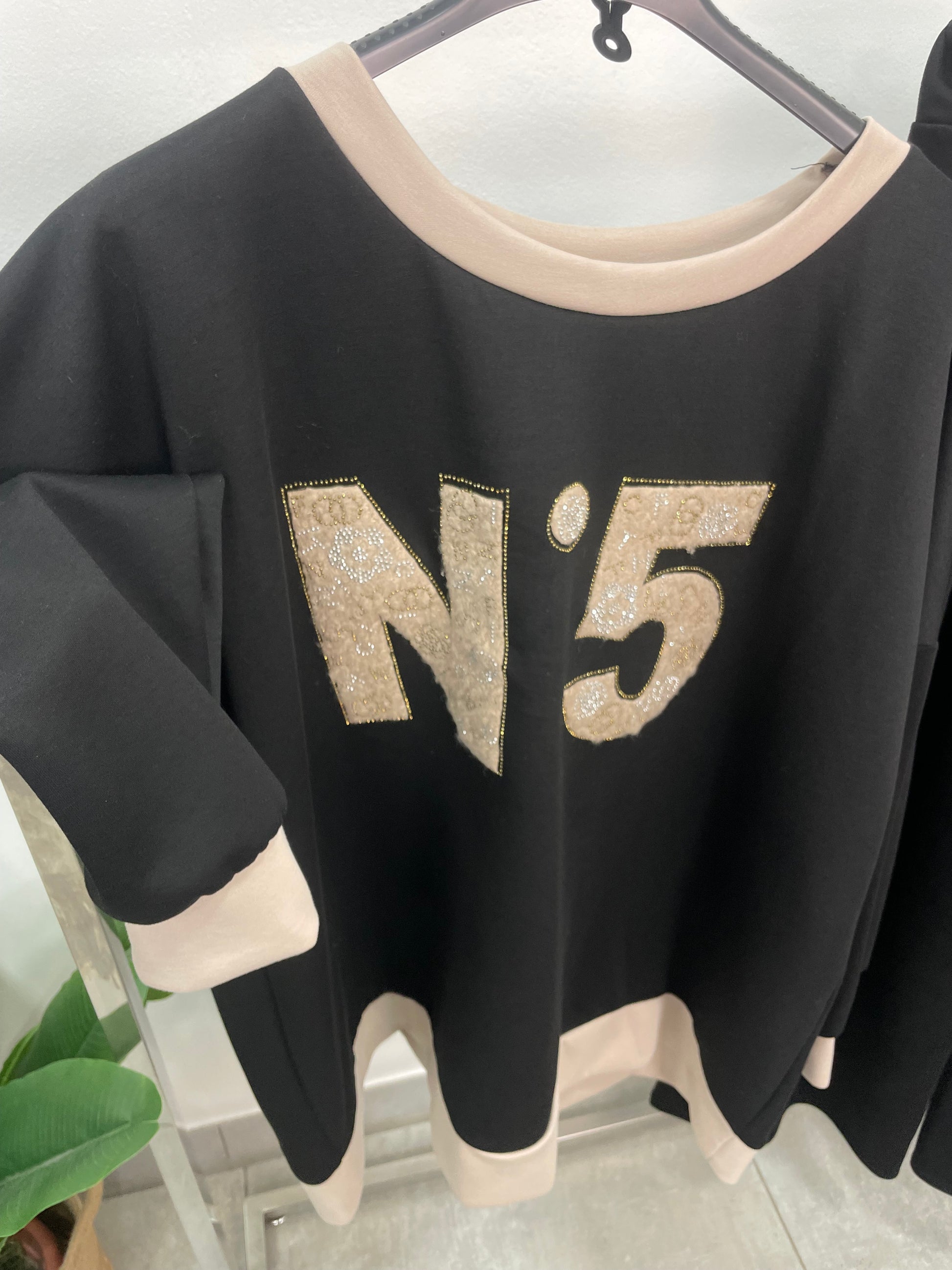 Coordinato tuta over, maglia con ricamo in rilievo dettagli strass oro e argento, pantalone a palazzo con elastico in vita