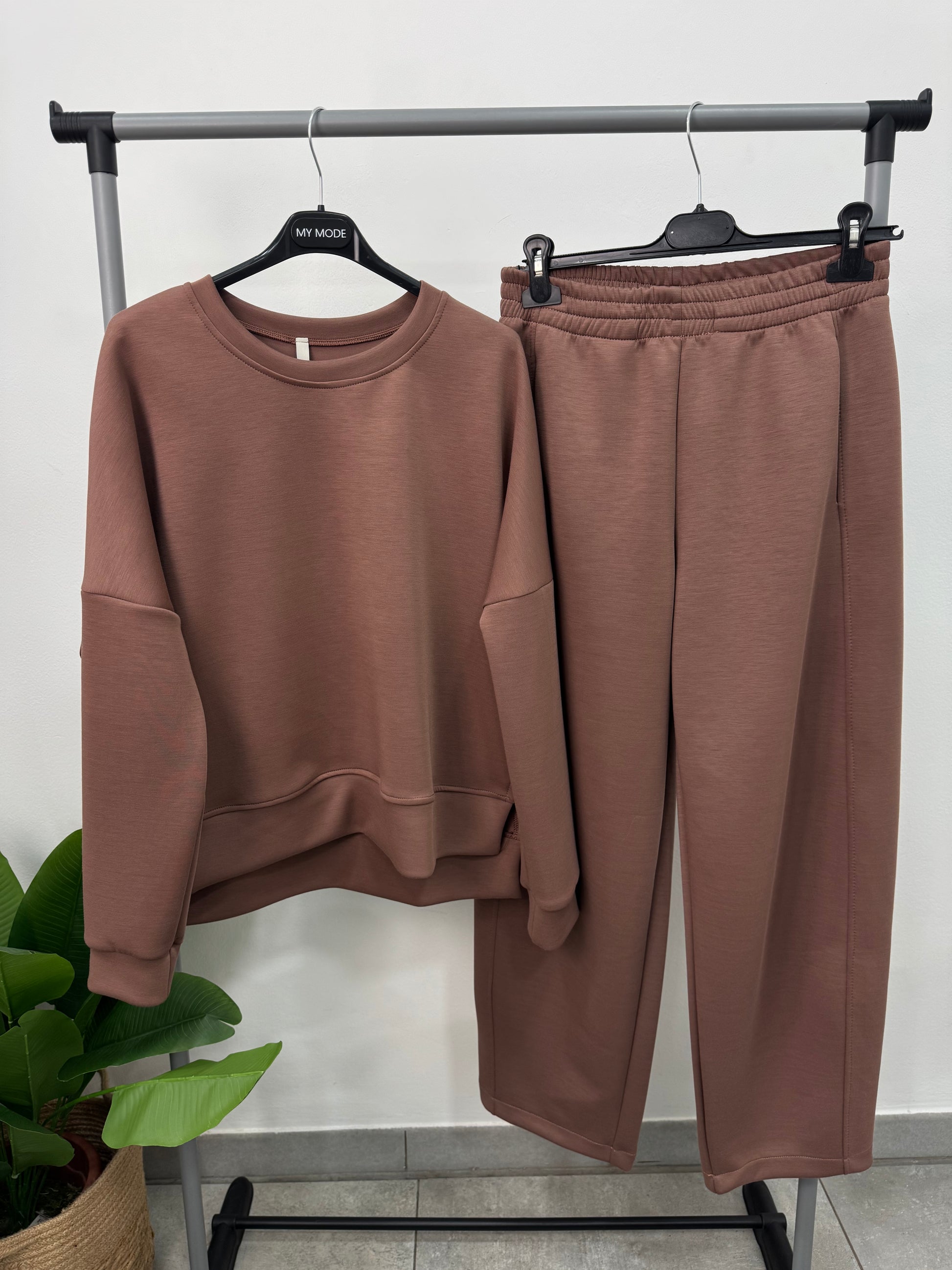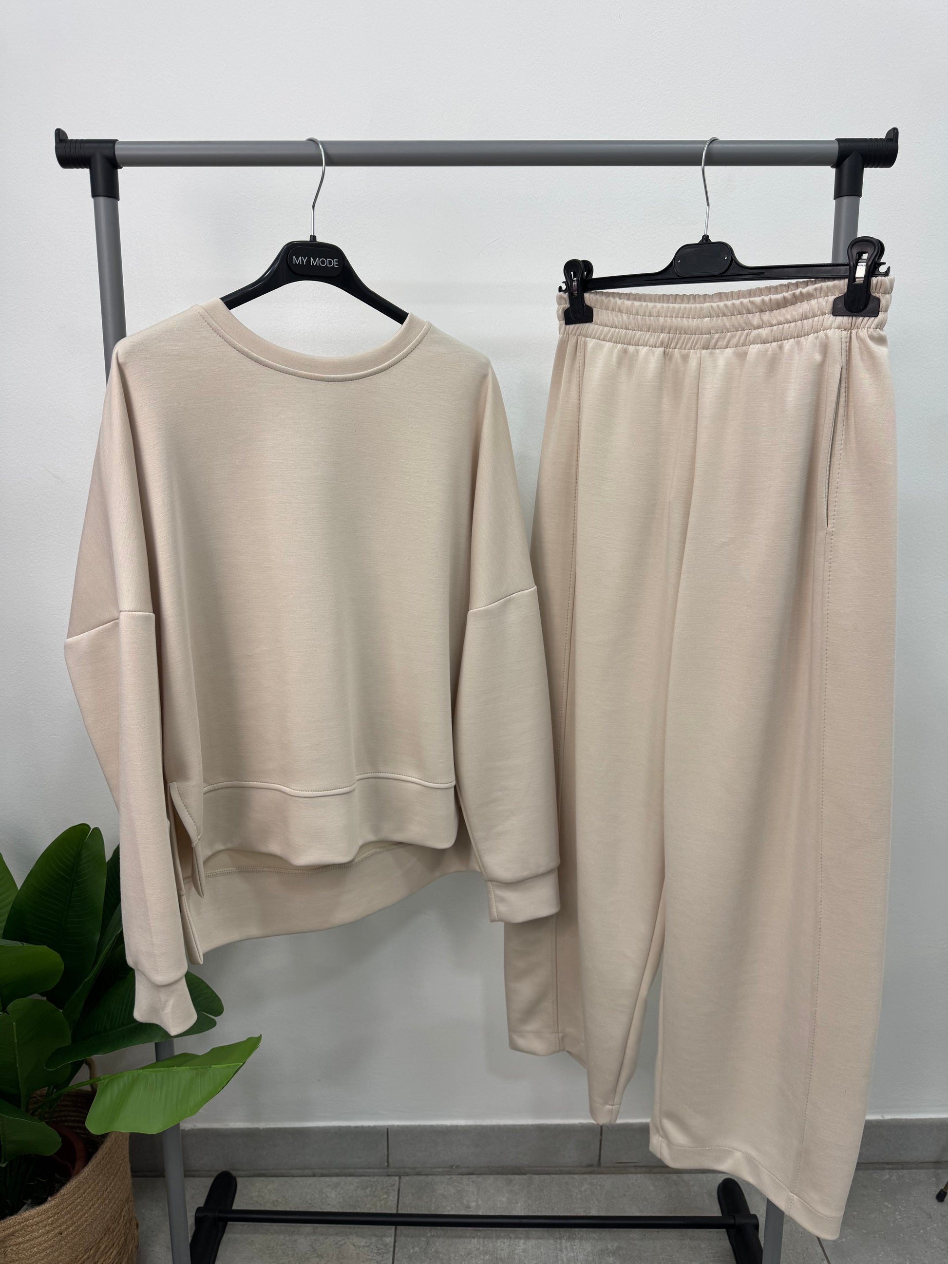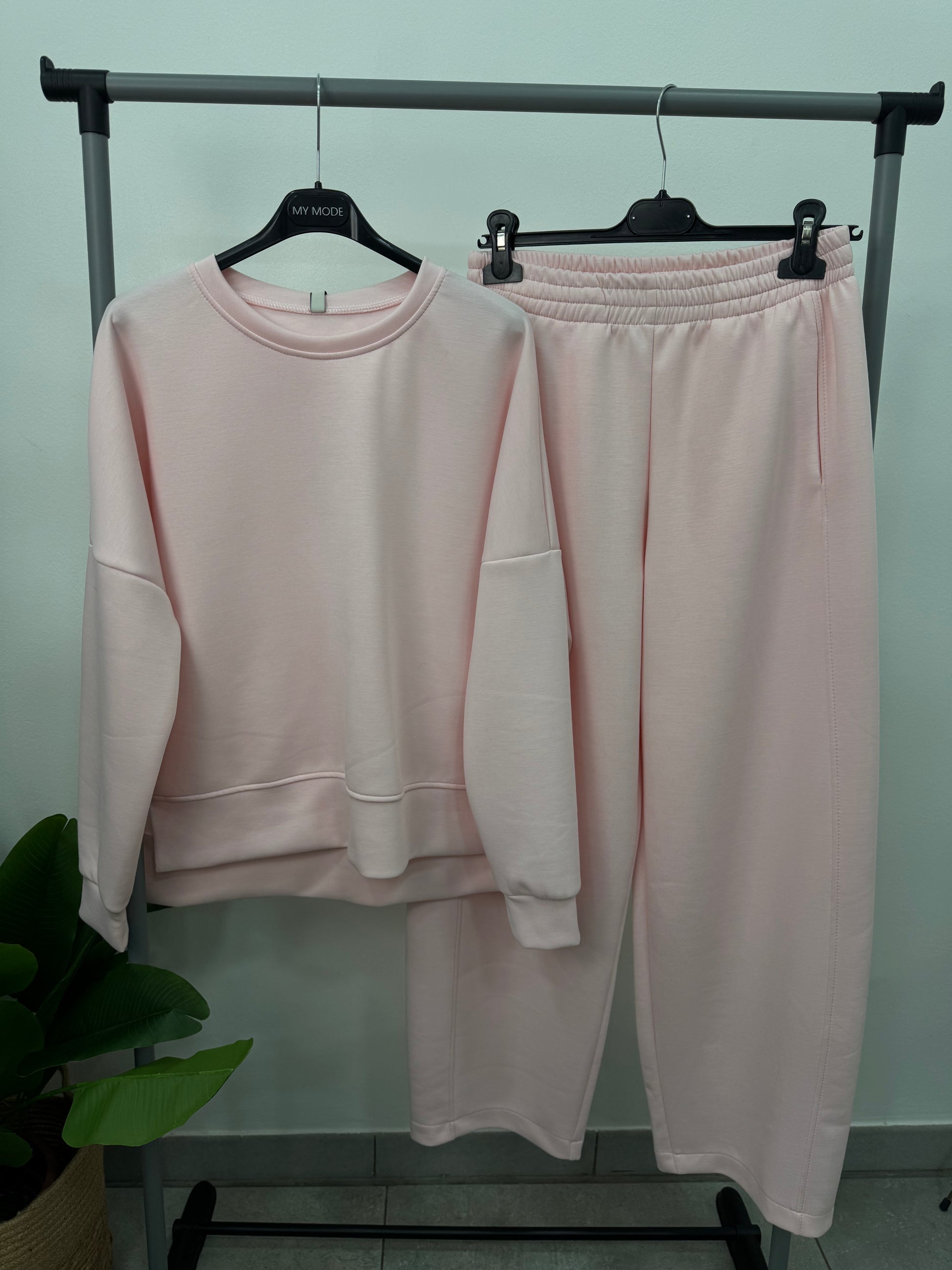 Coordinato composto da pantalone della tuta soft balloon con cuciture laterali, tasche ed elastico in vita e felpa girocollo con spacchi laterali e leggermente più lunga dietro.
