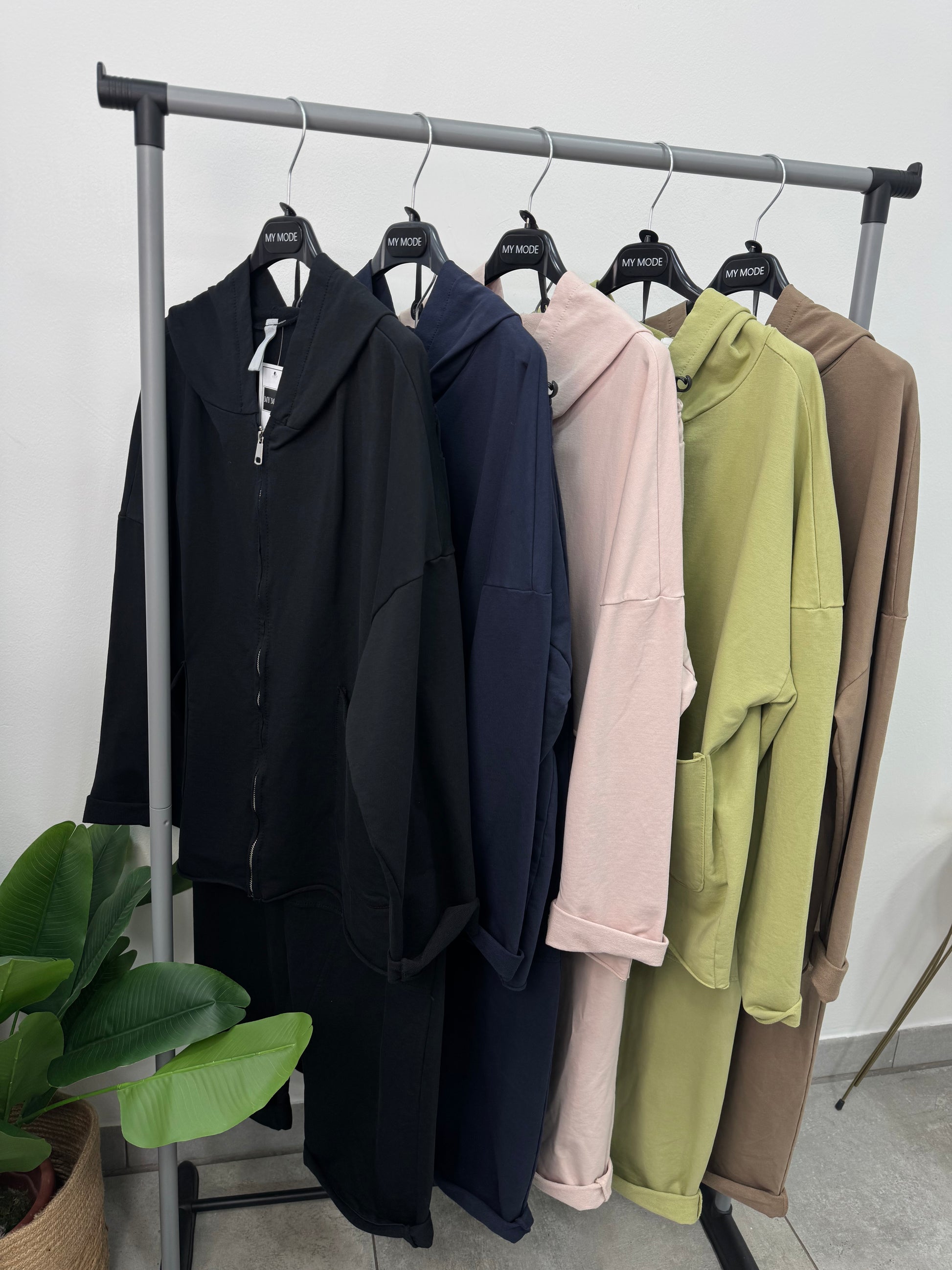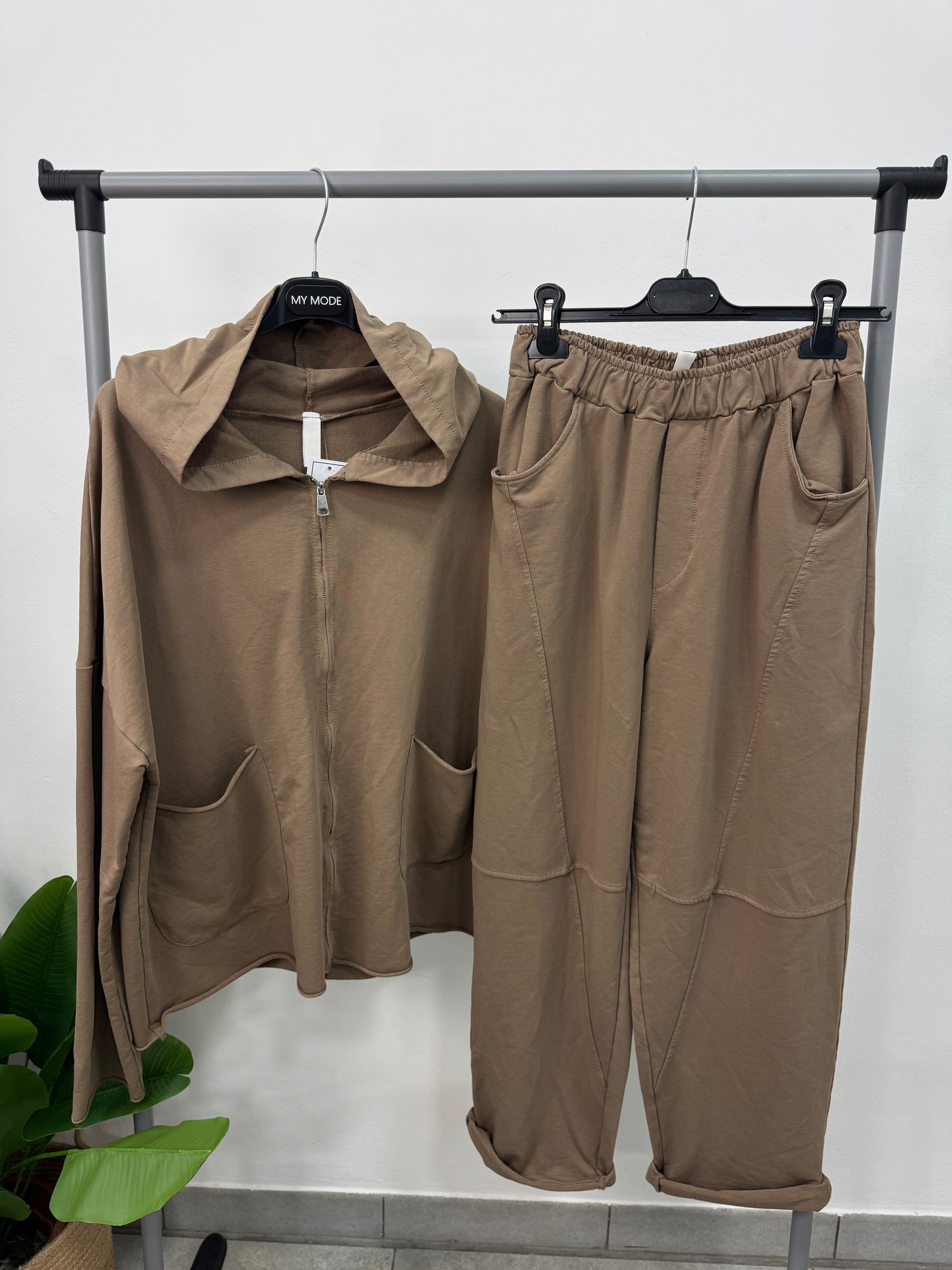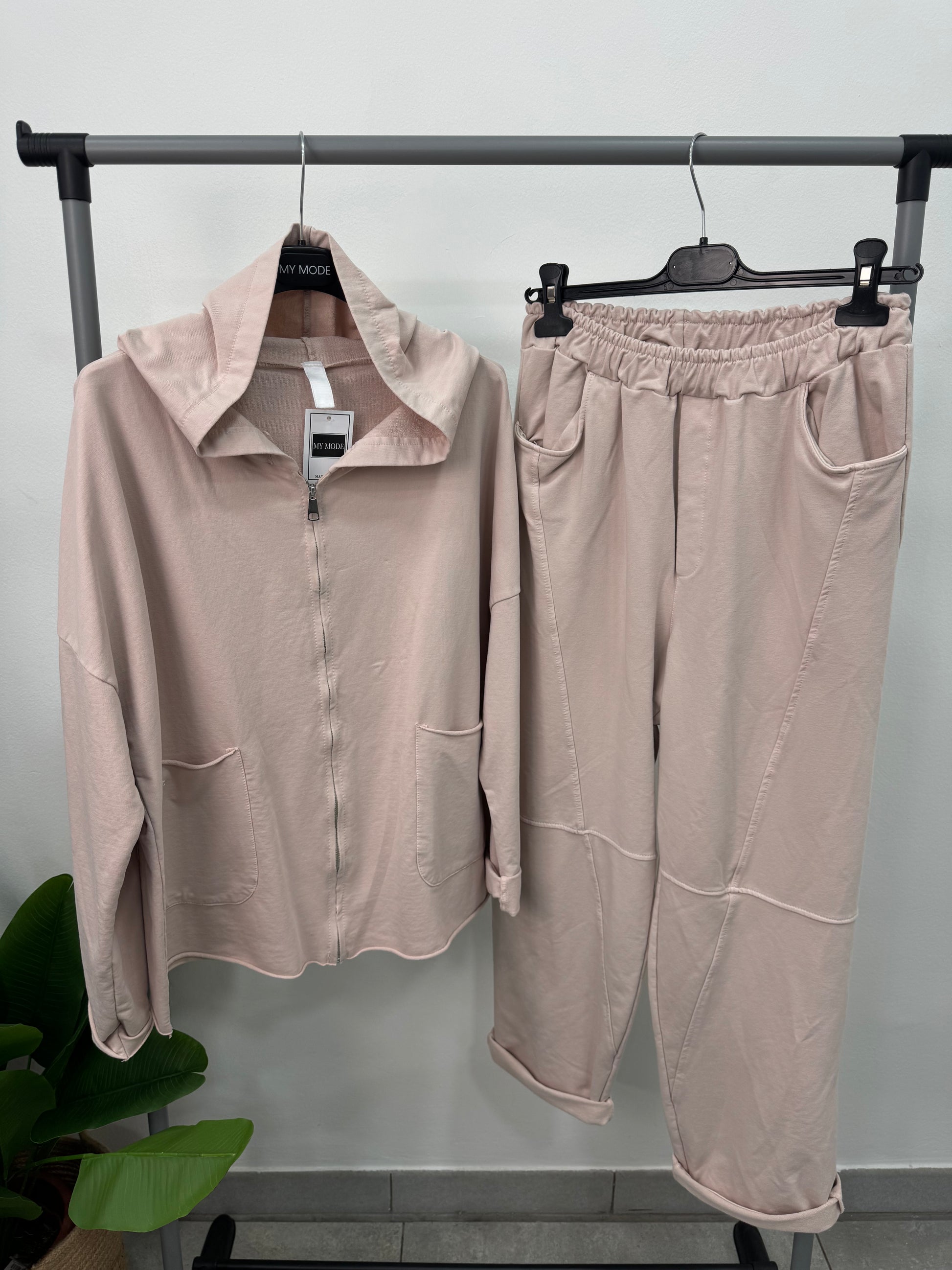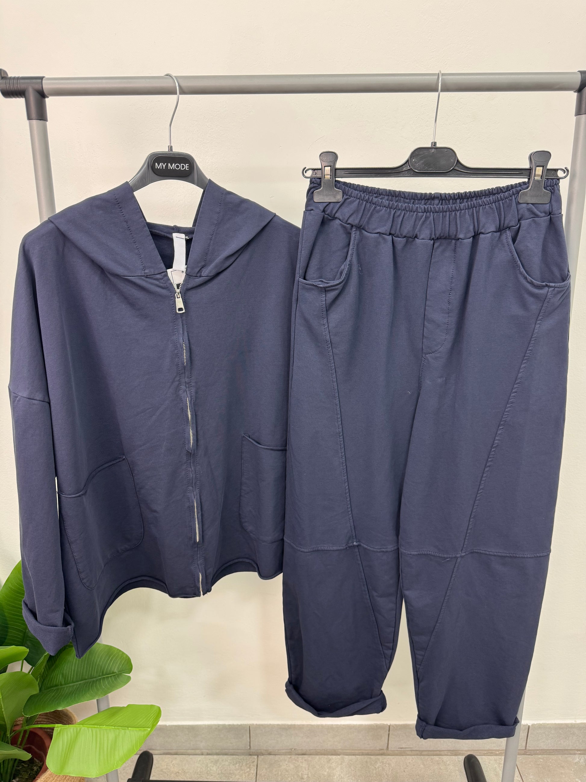 Coordinato tuta composto da pantalone balloon con tasche ed elastico in vita e felpa con cappuccio, zip e tasche.