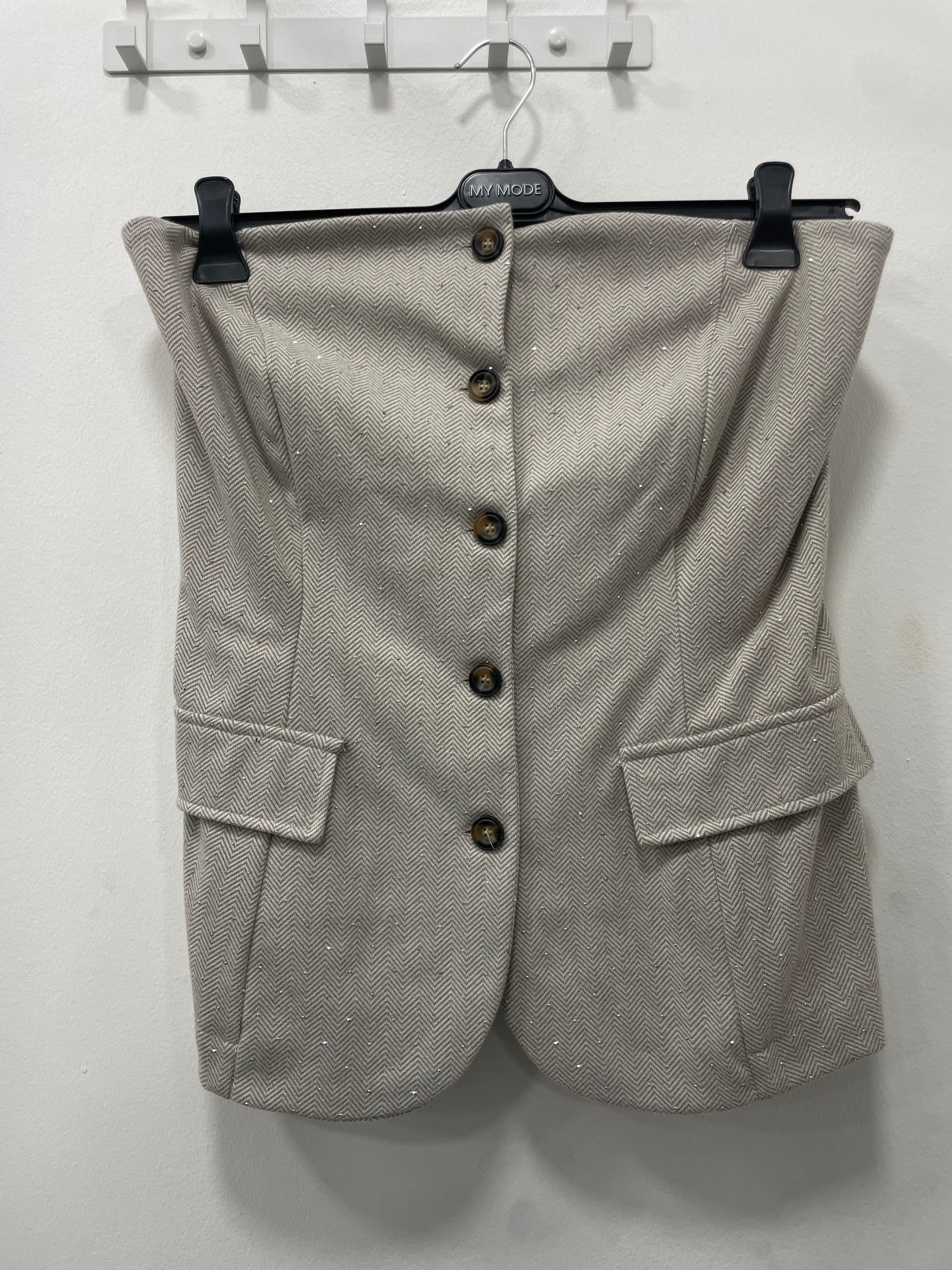 Corsetto over con dettagli strass, bottoni, tasche finte, elastico sul retro.