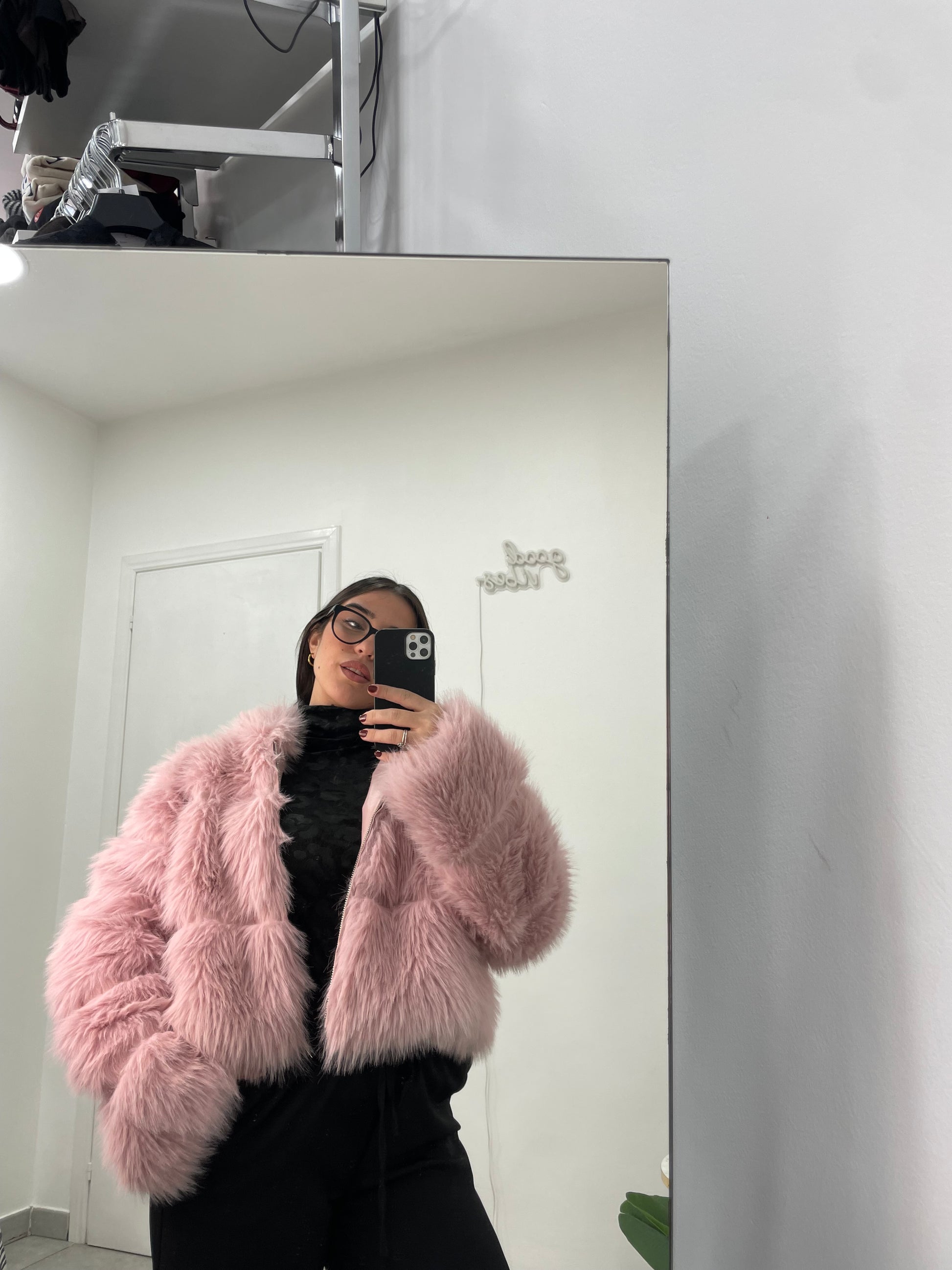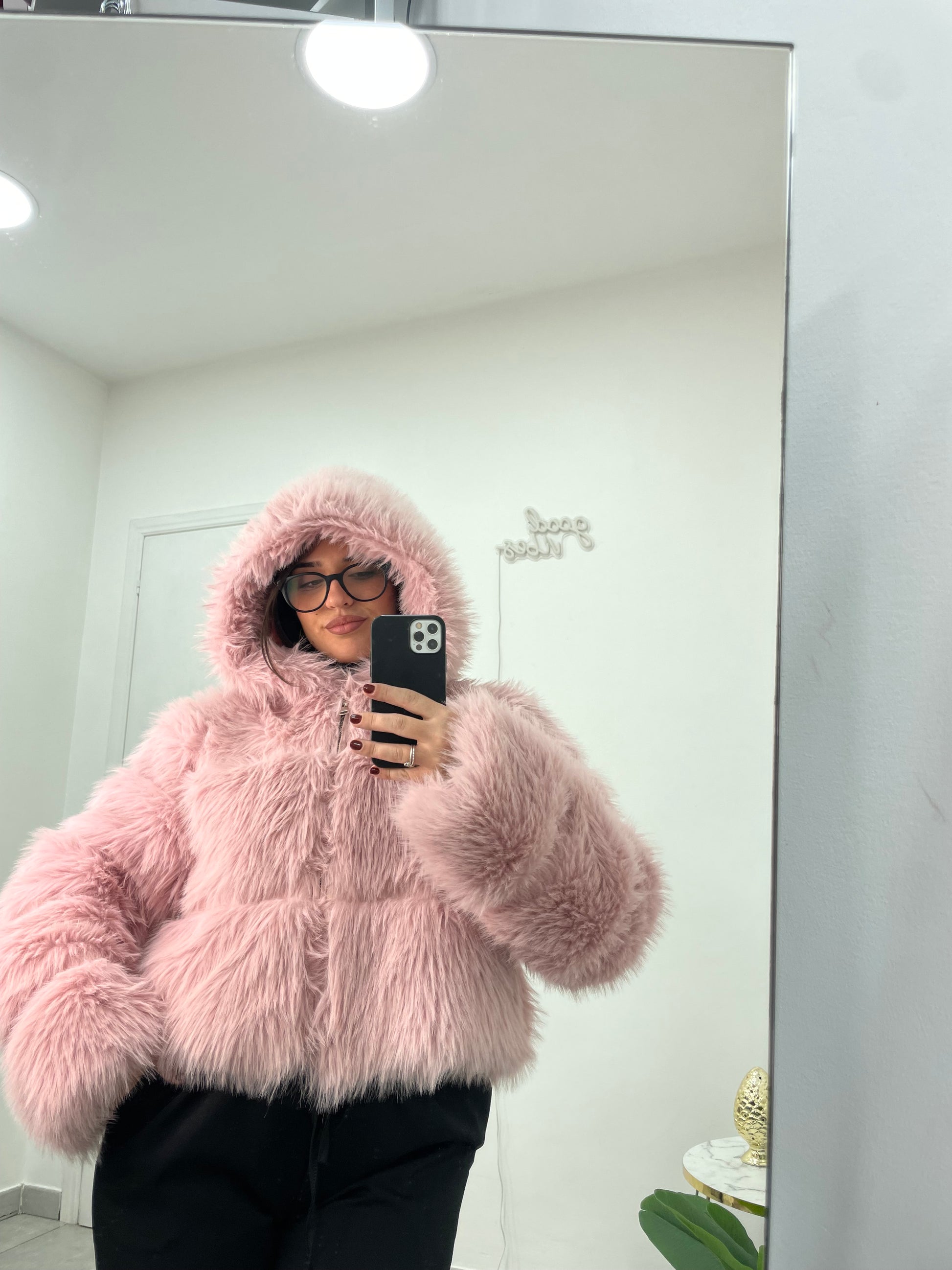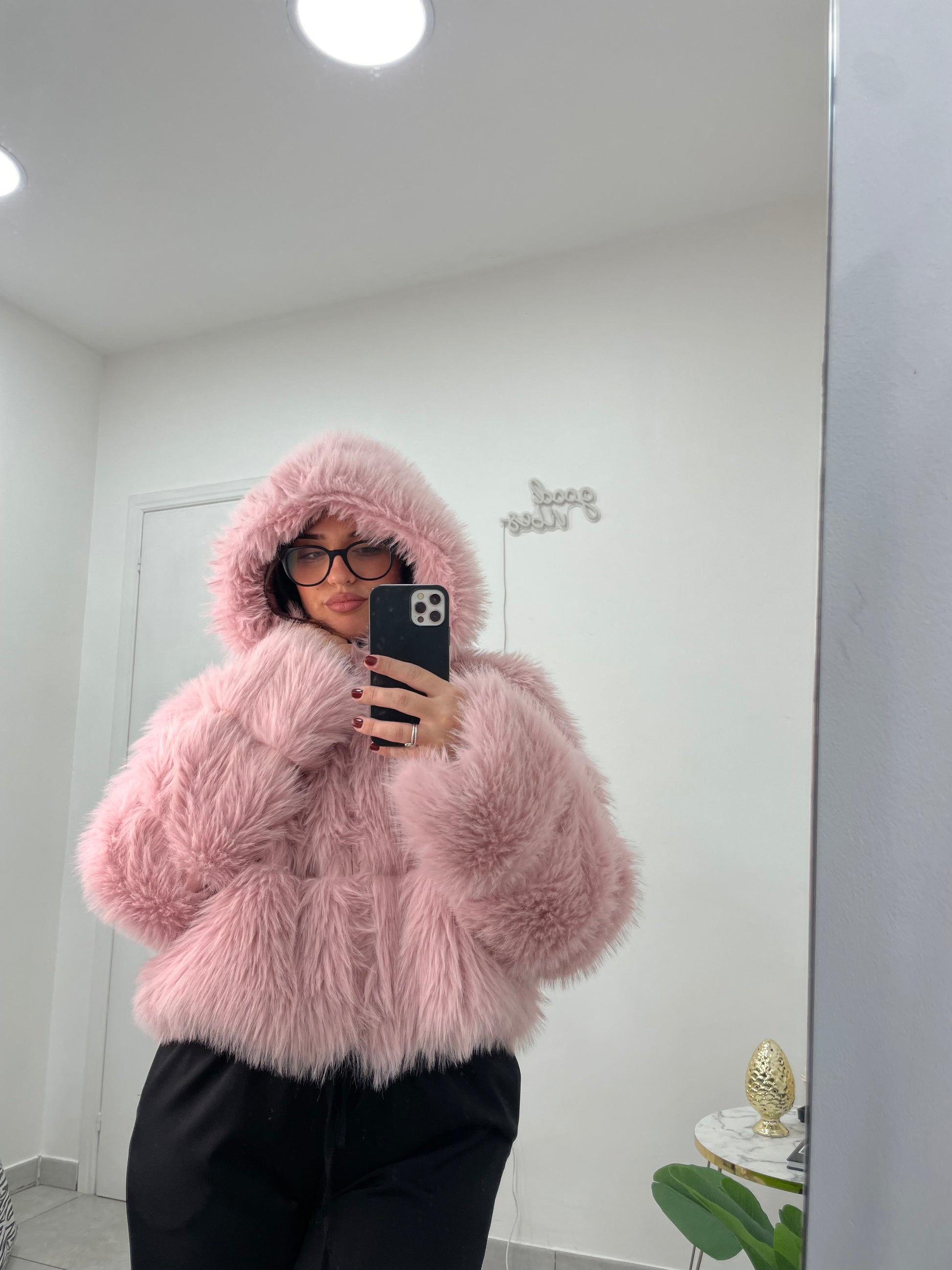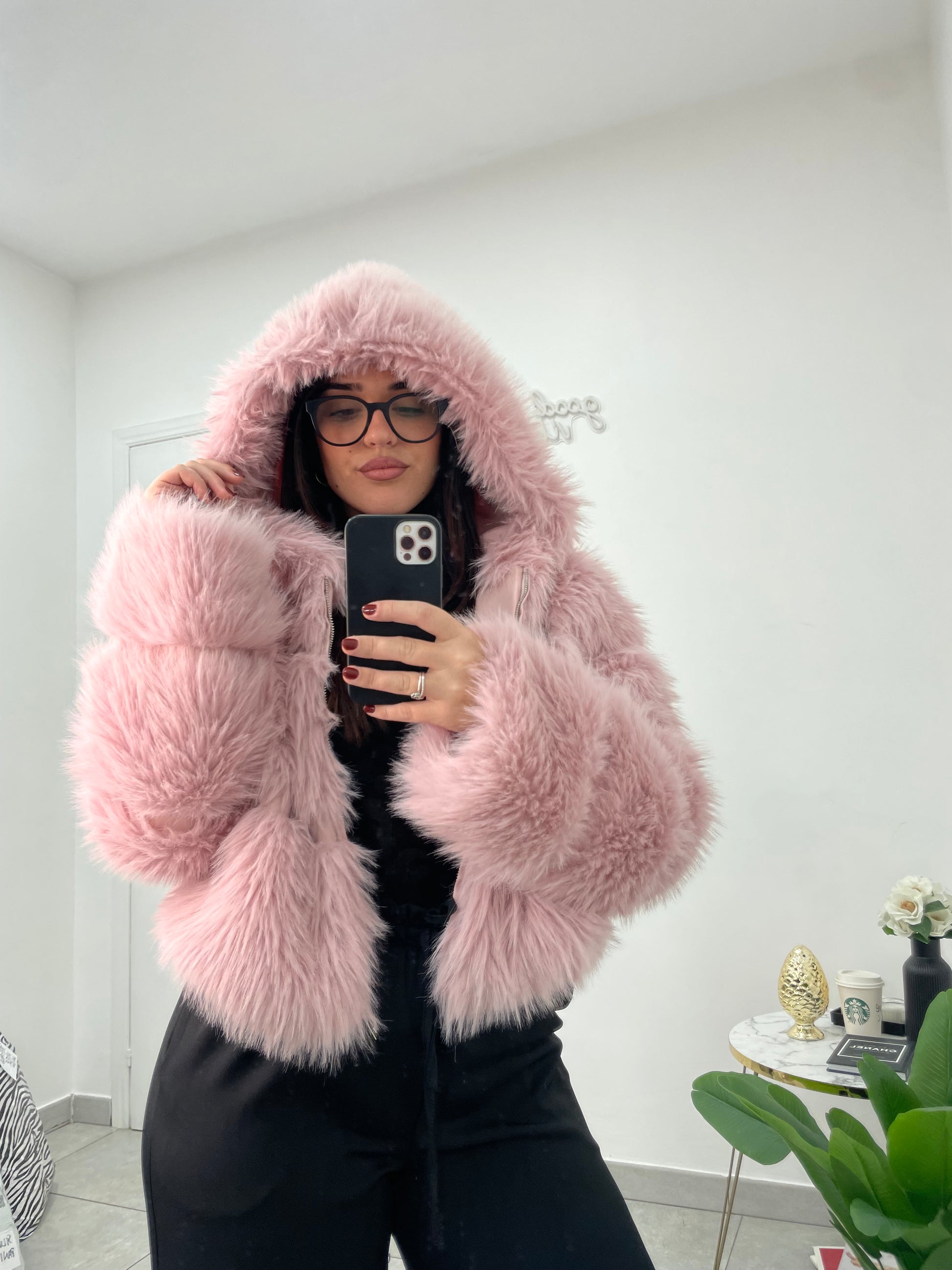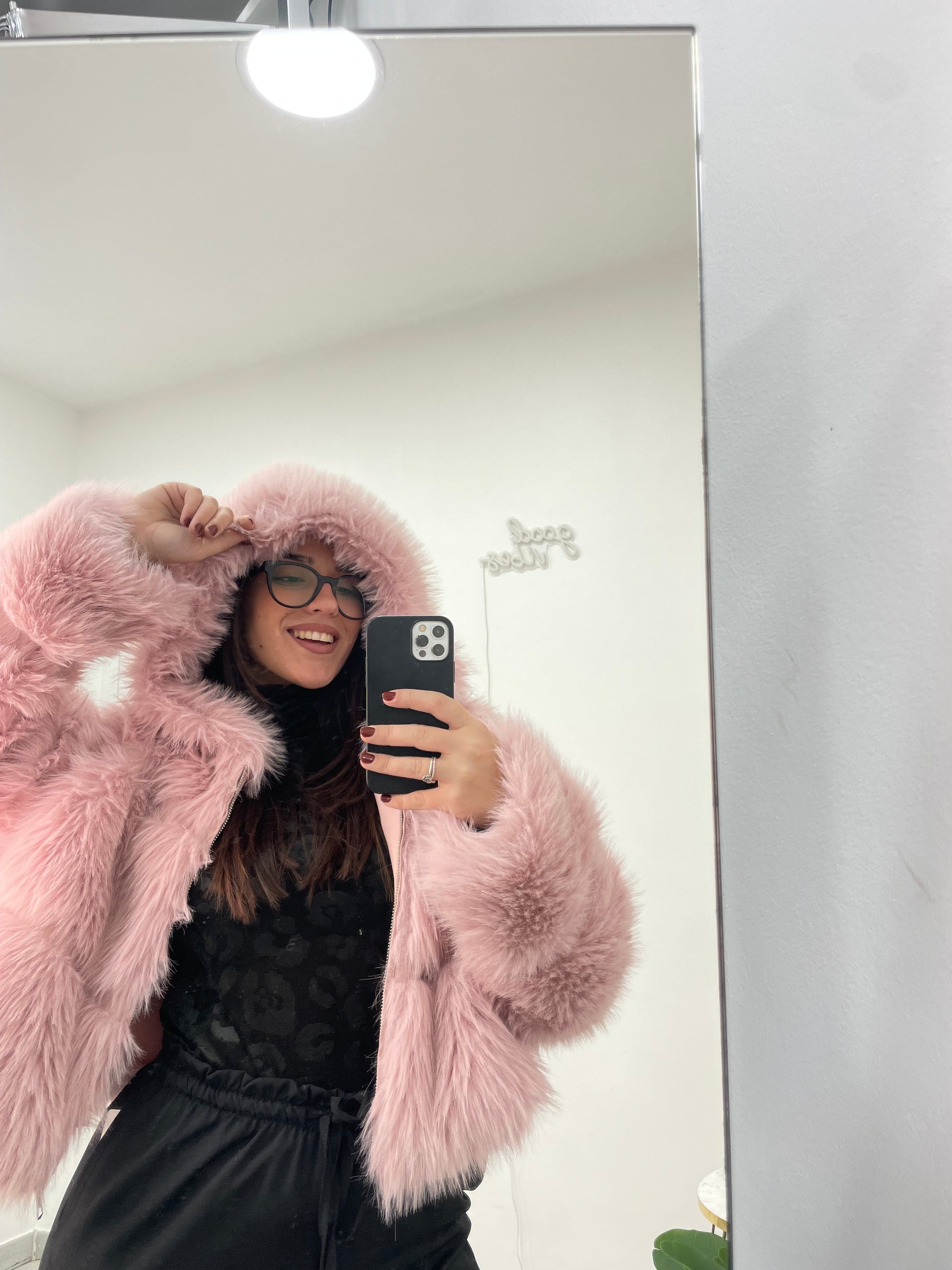 Ecoelliccia corta con cappuccio, zip e tasche.