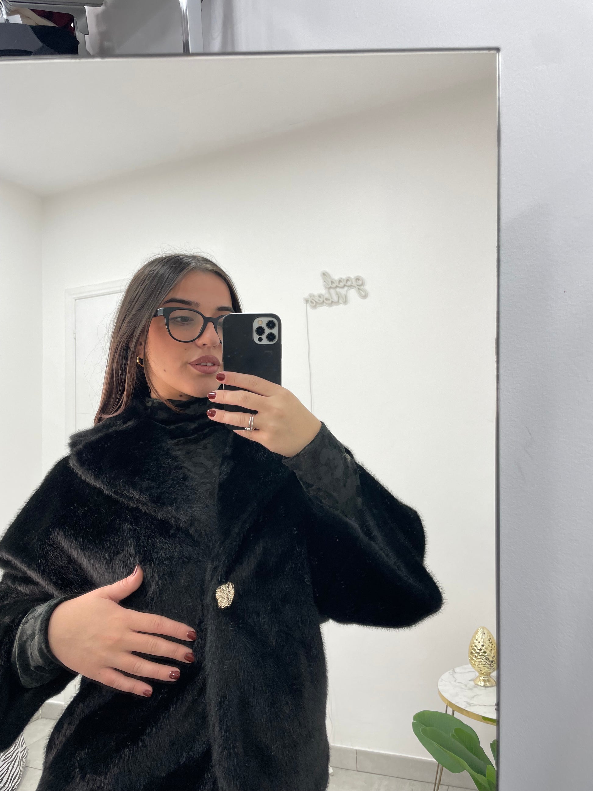 Ecopelliccia con bottone gioiello oro e a mezze maniche.