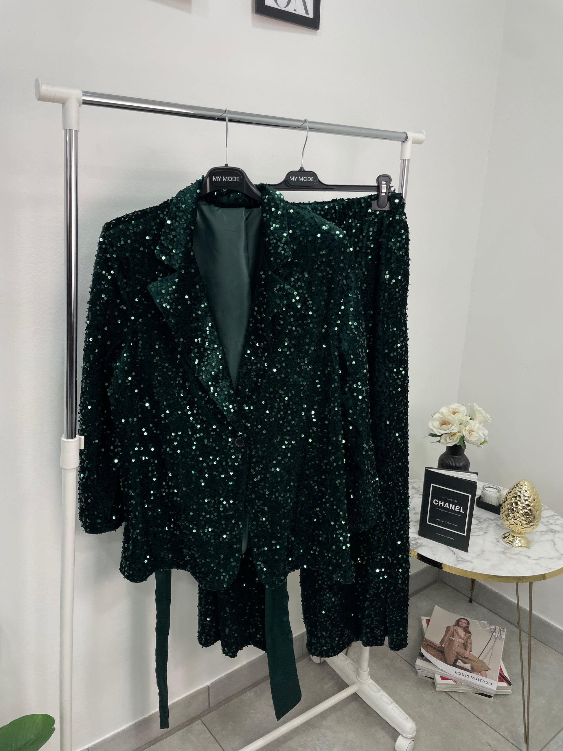 Giacca ricoperta di paillettes, con cinta e bottone.