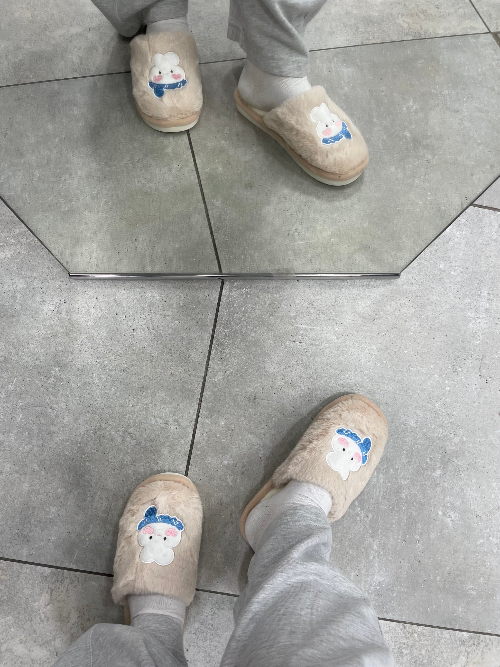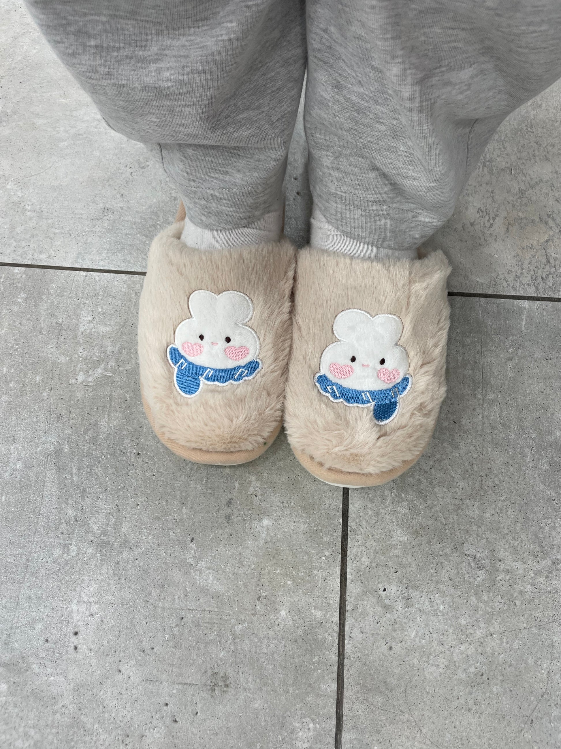Pantofole calde con coniglietti cuciti sopra.
