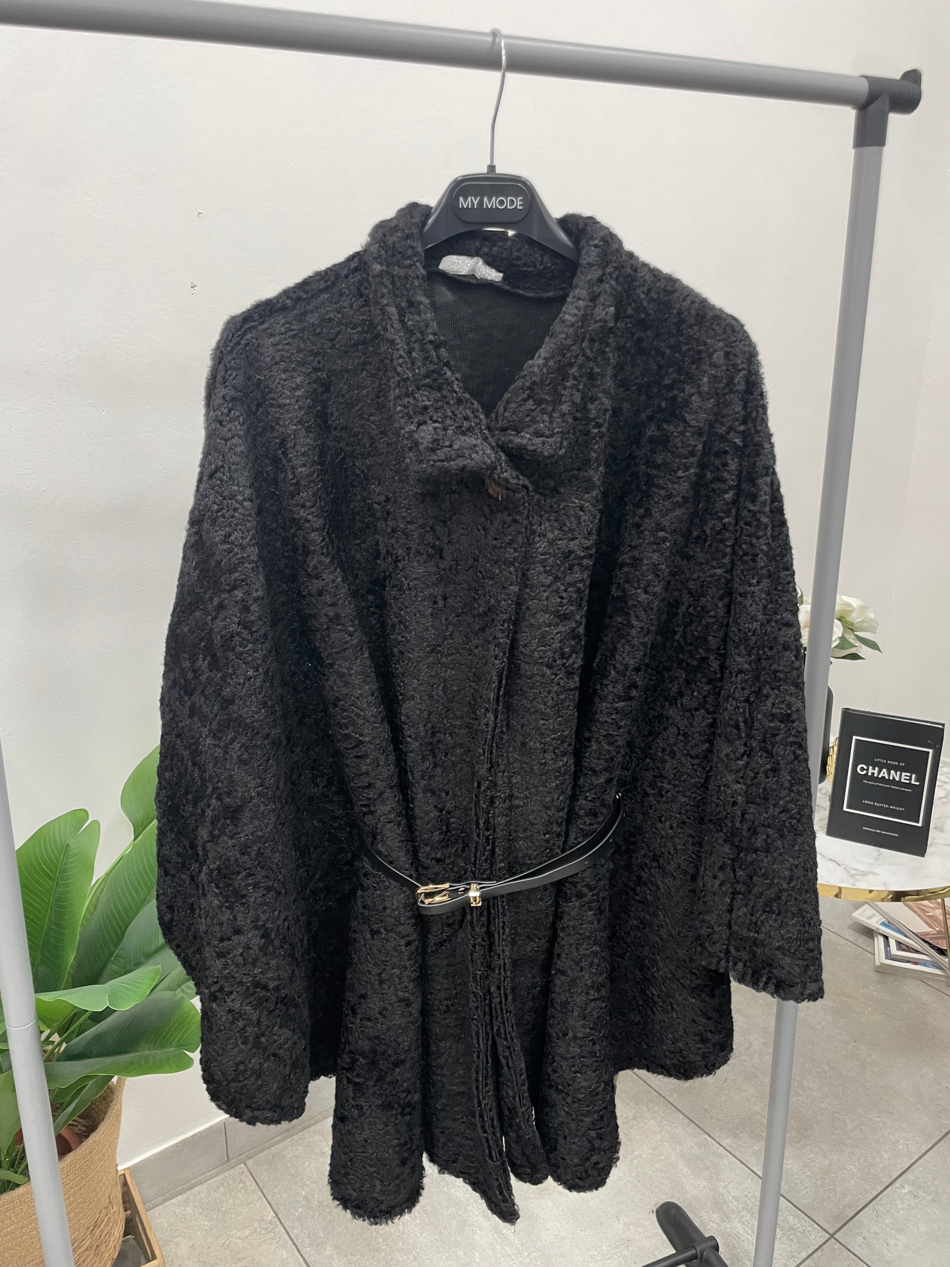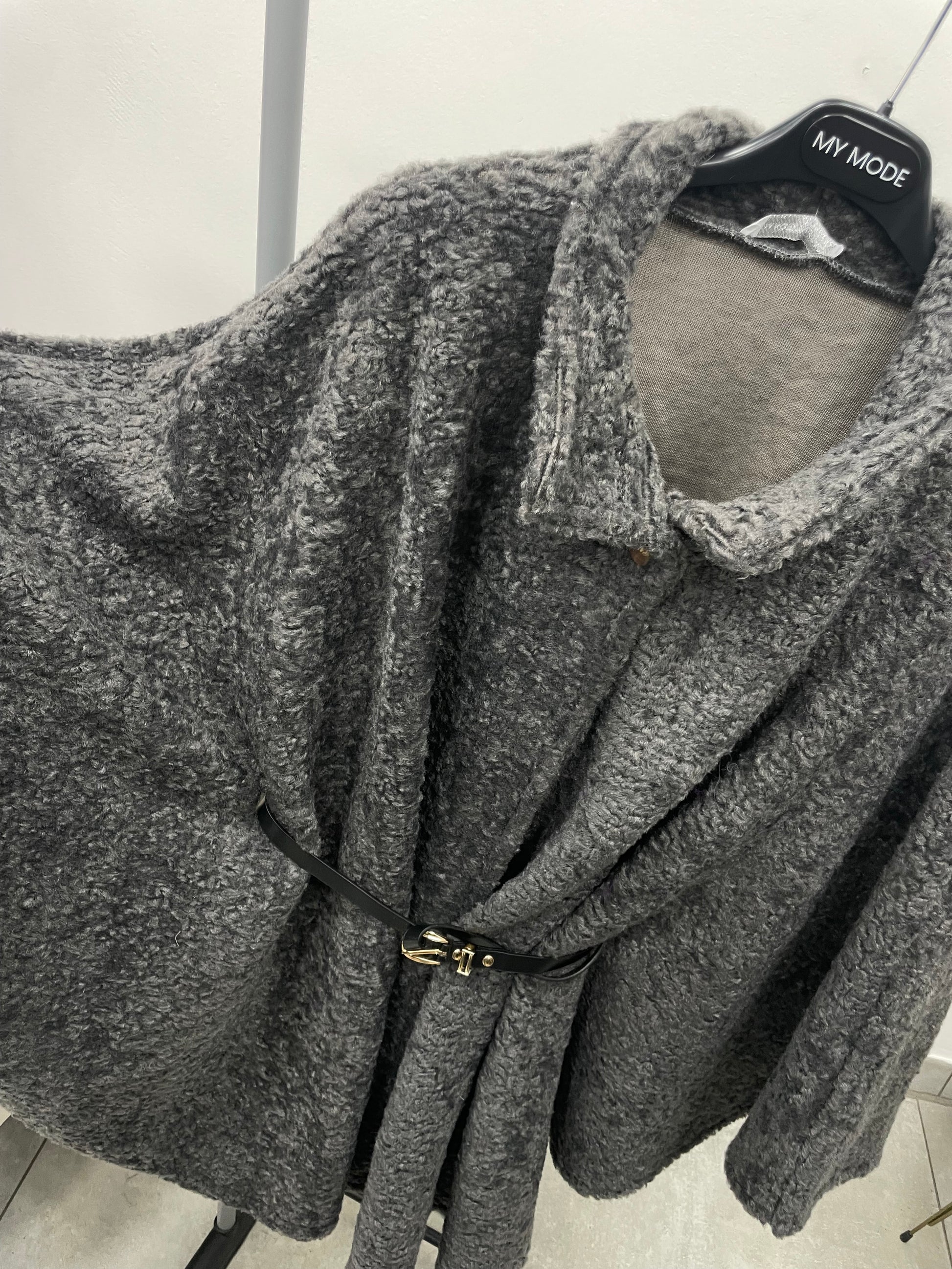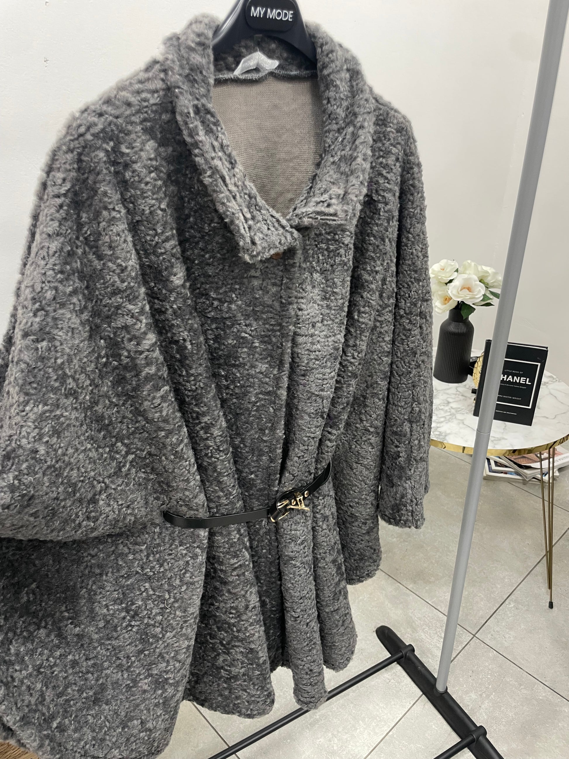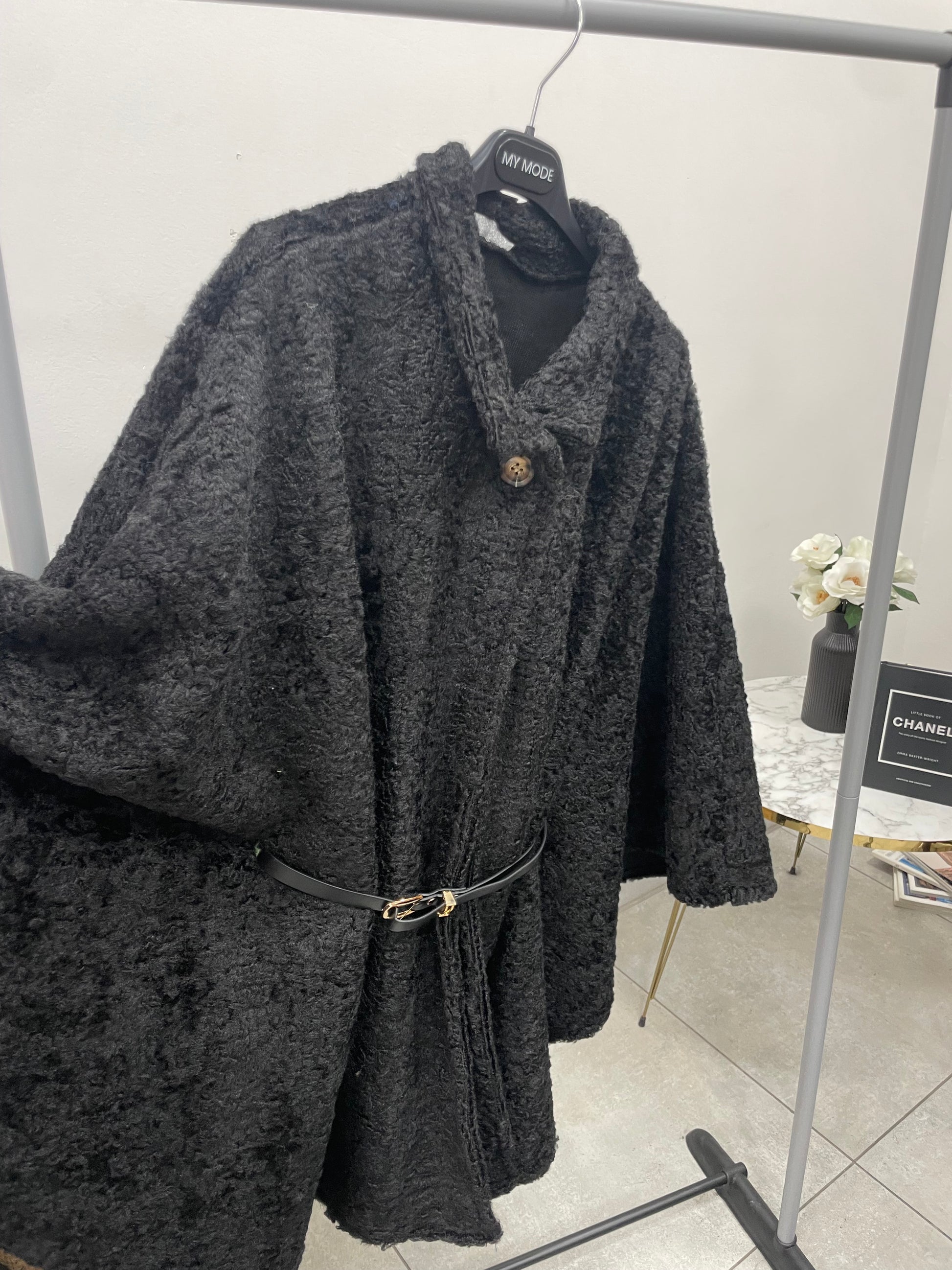 Mantella con cintura incorporata in bouclé, bottone al collo.