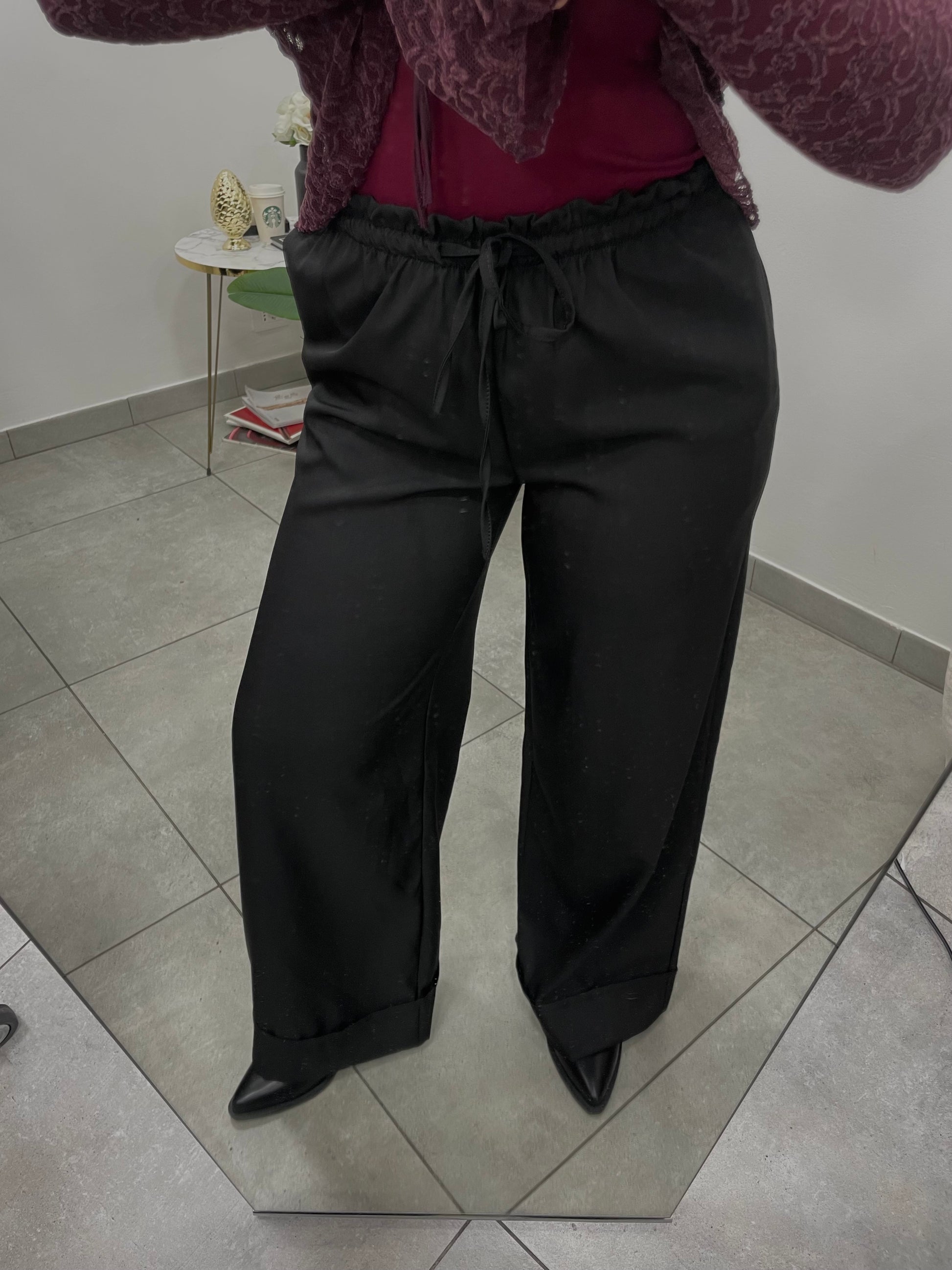 Pantalone palazzo con risvolto e laccetto per regolare in vita.
