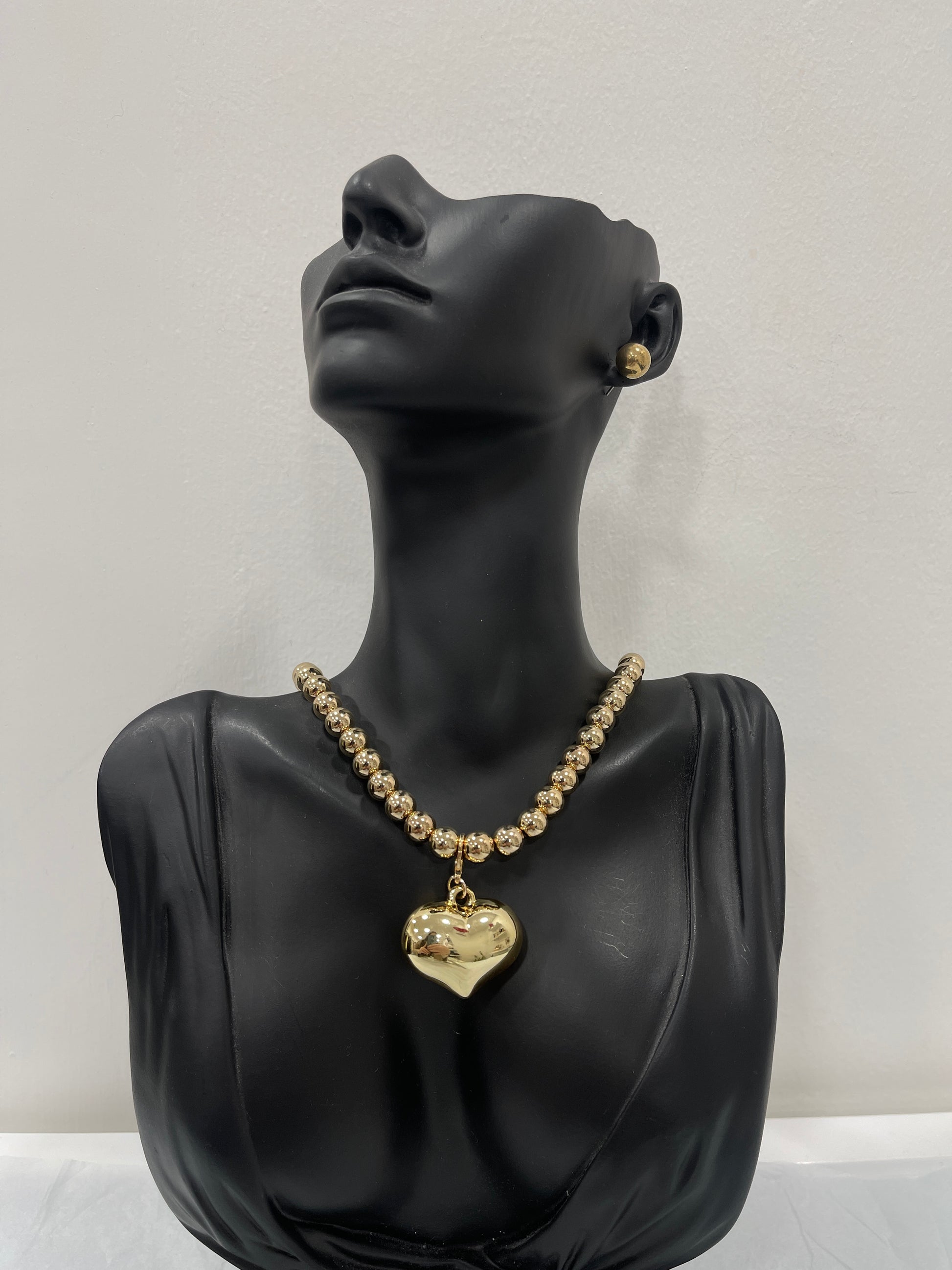 Parure di collana con perline e ciondolo a cuore e orecchini abbinati.
