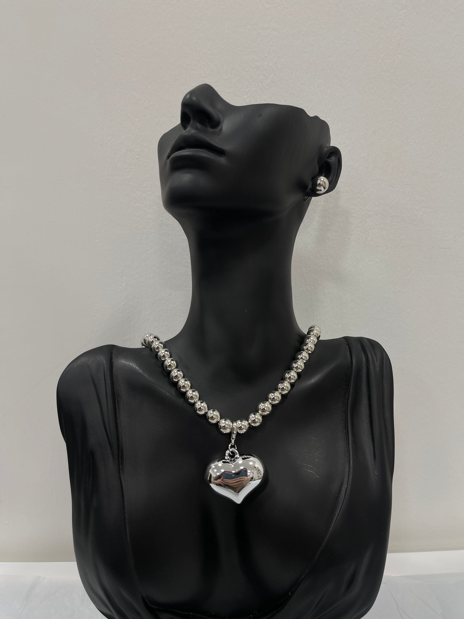 Parure di collana con perline e ciondolo a cuore e orecchini abbinati.