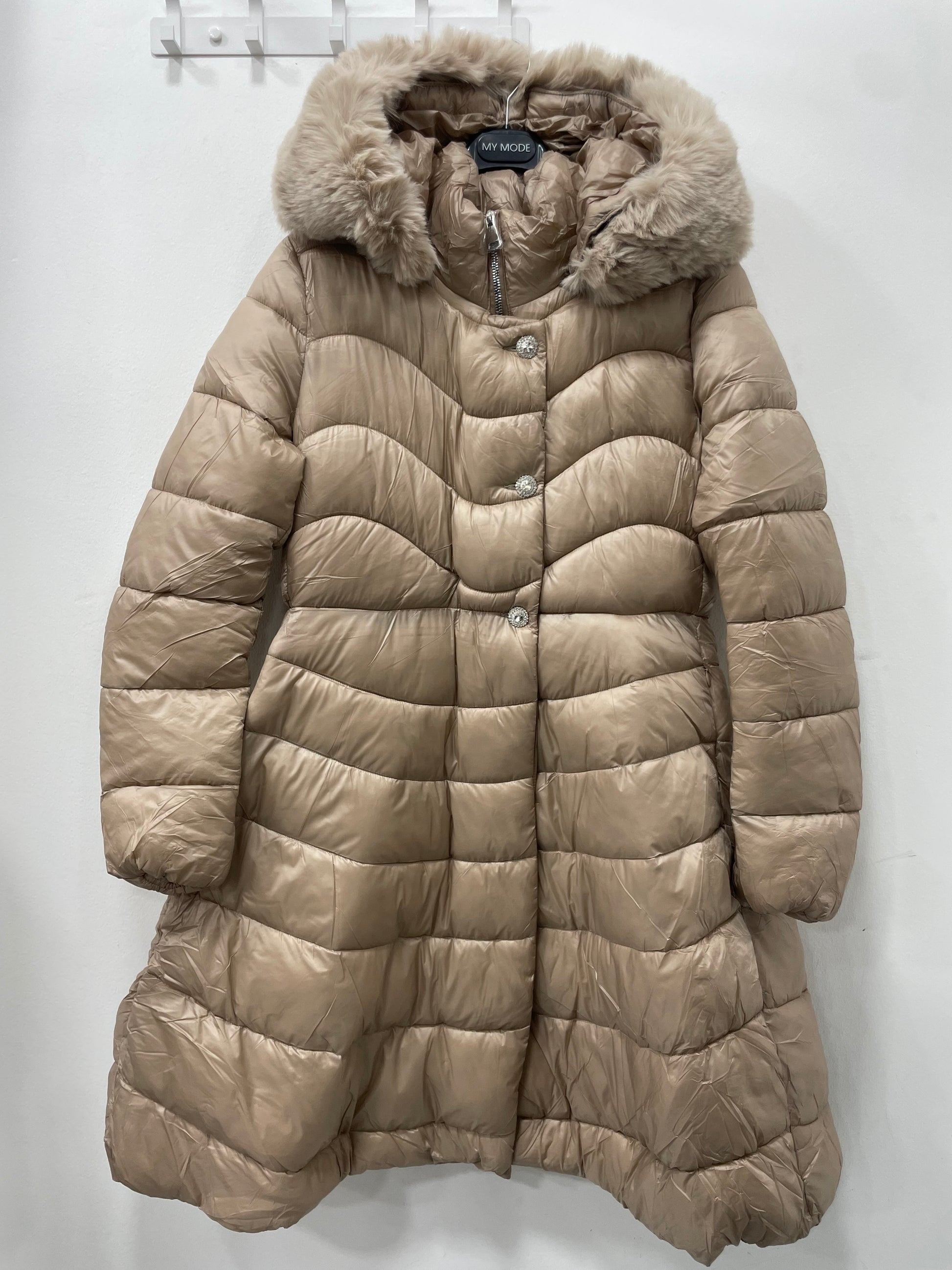 Piumino lungo avvitato, bottoni gioiello, tasche con zip, cappuccio con pelliccia rimovibili.