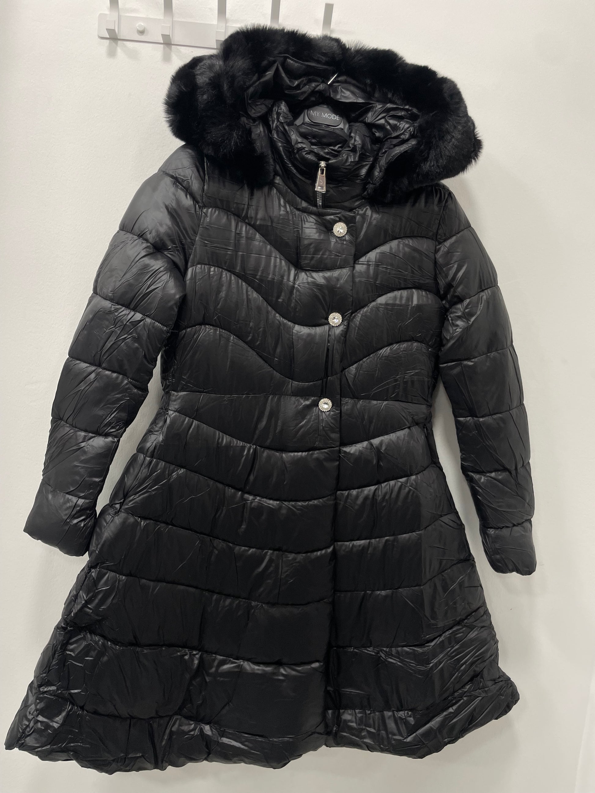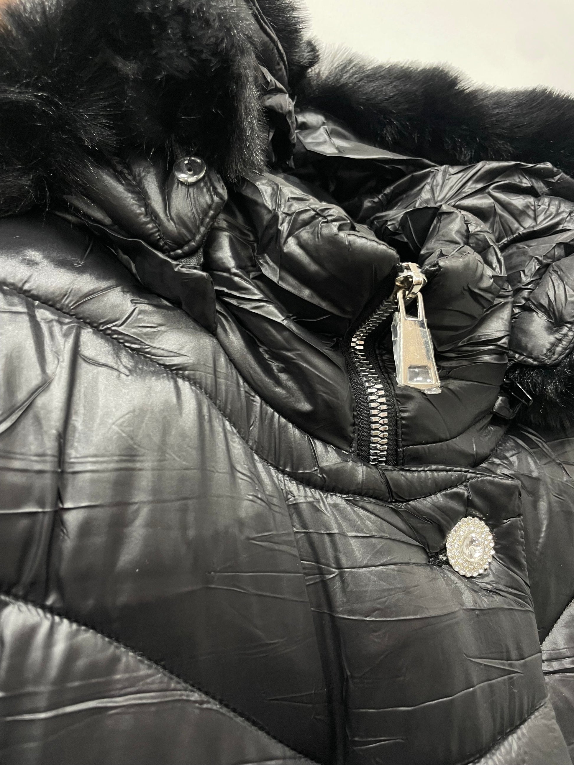 Piumino lungo avvitato, bottoni gioiello, tasche con zip, cappuccio con pelliccia rimovibili.
