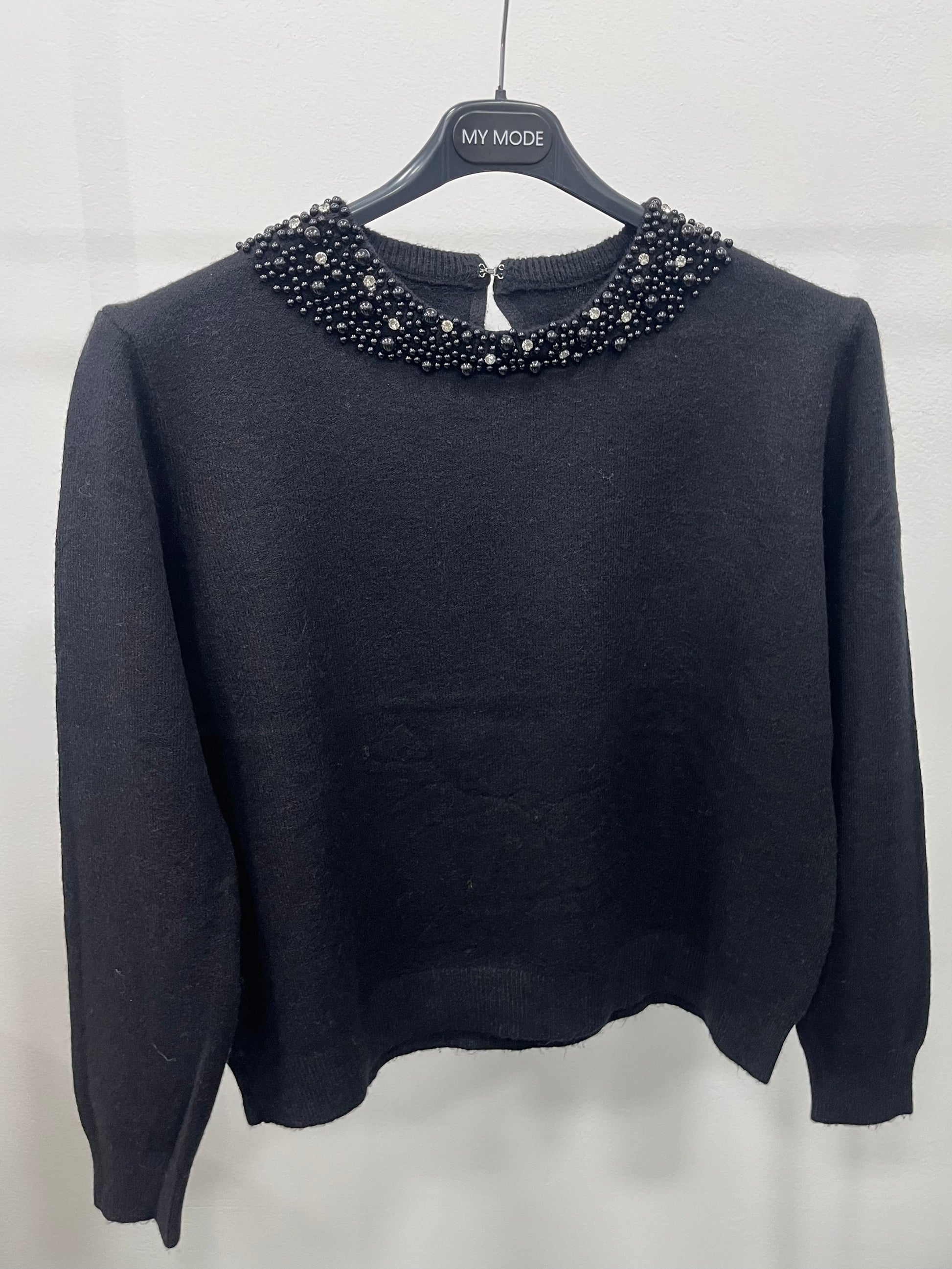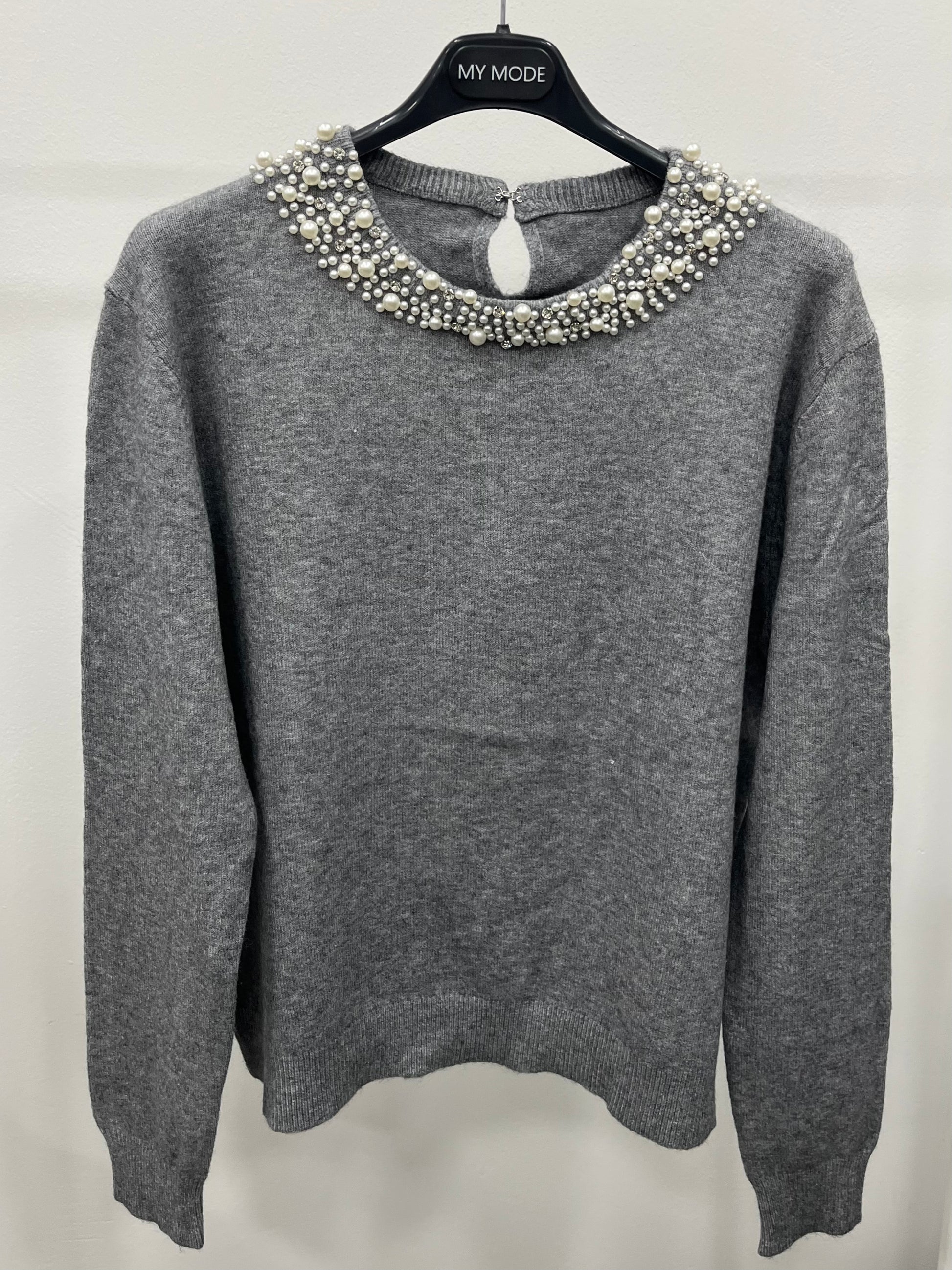 Pullover con gancetto dietro il collo e girocollo impreziosito con perle e Swarovski.