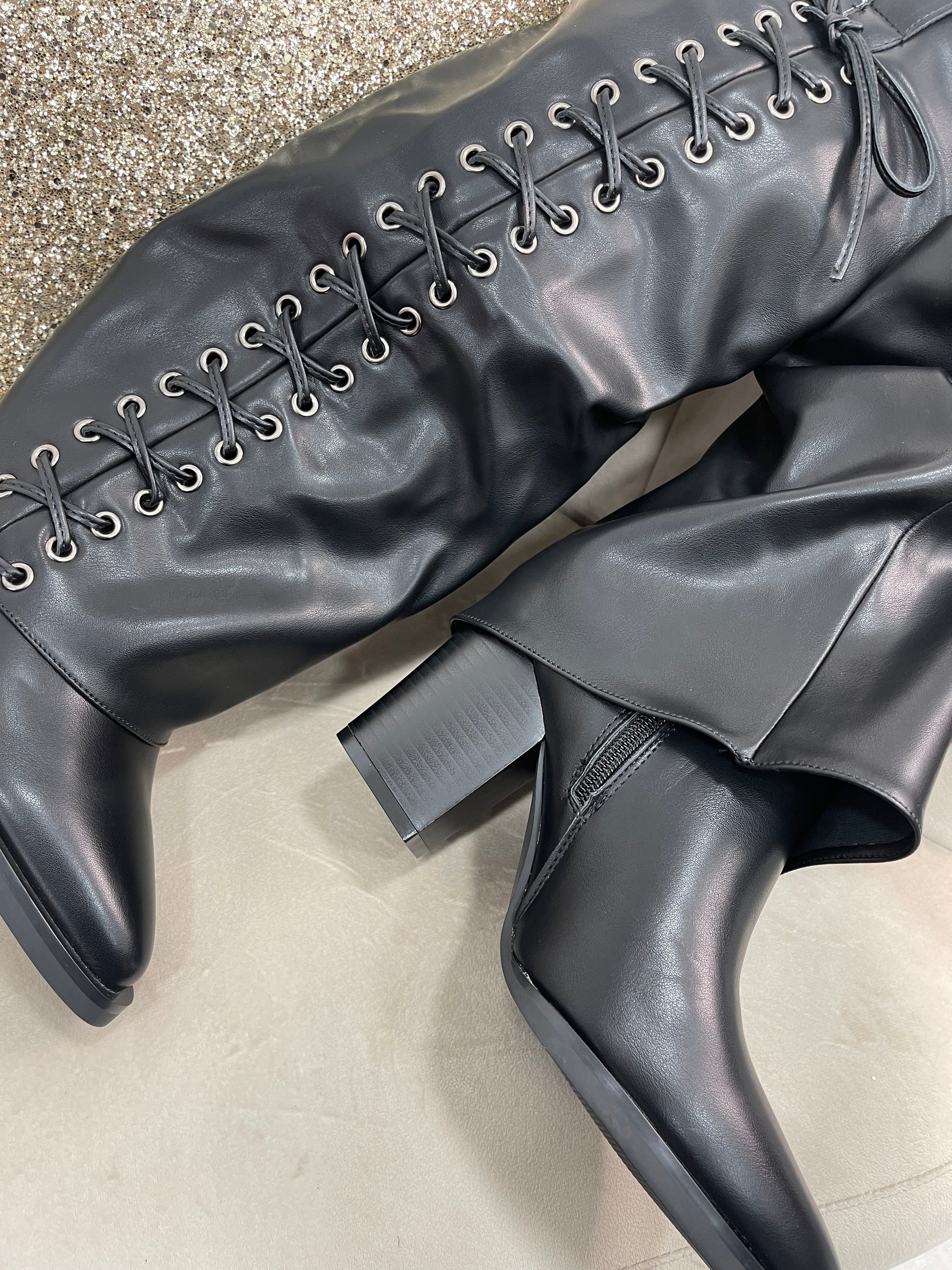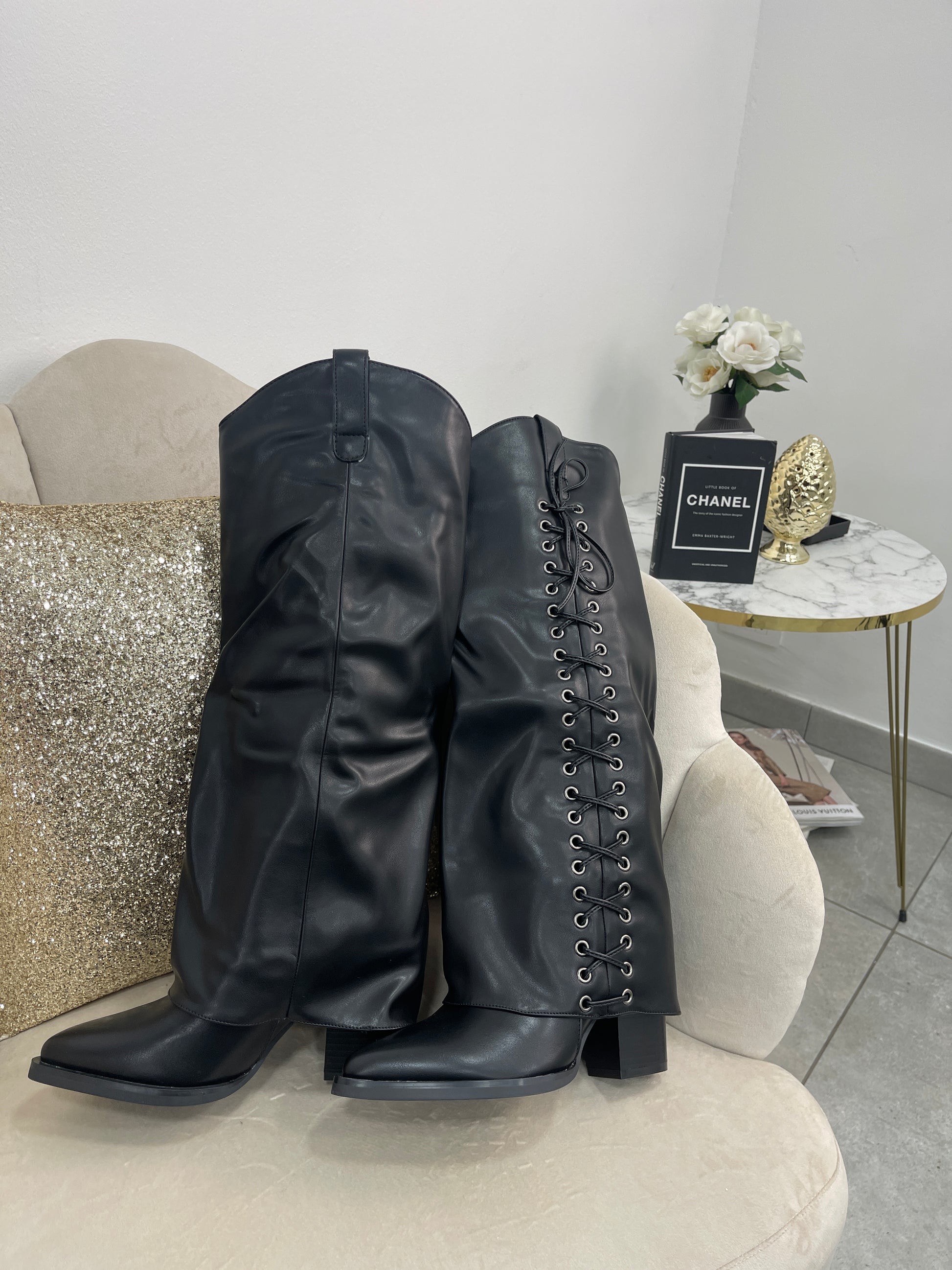 Stivale con risvolto, tacco, lacci laterali e zip interna.