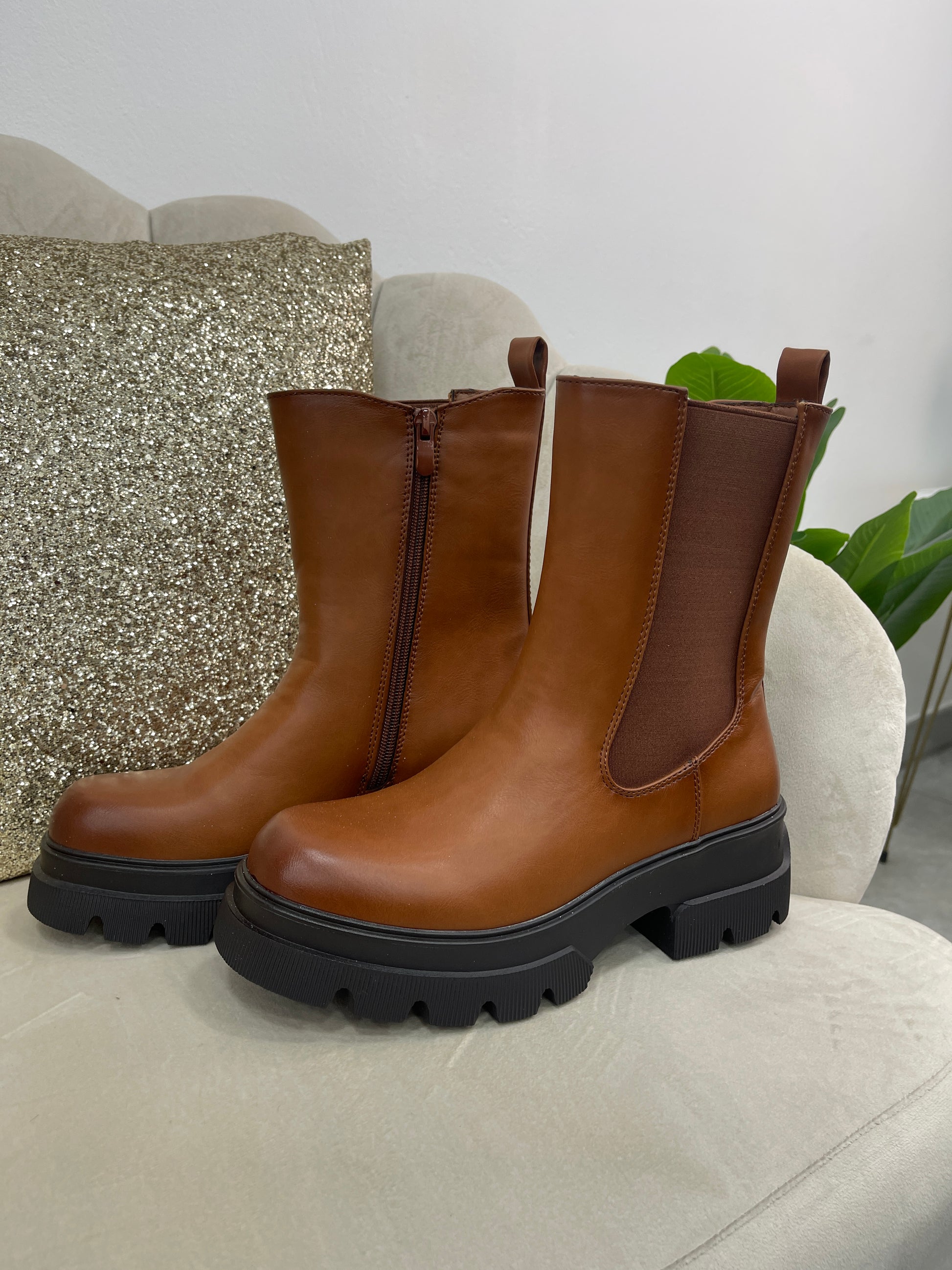 Stivaletto Camel con elastico e zip laterali e con plateau nero.