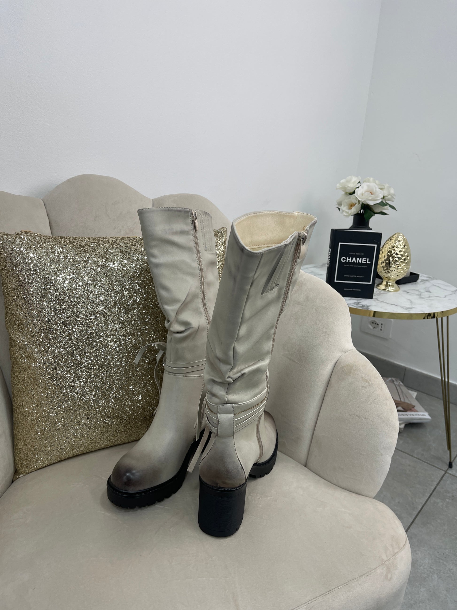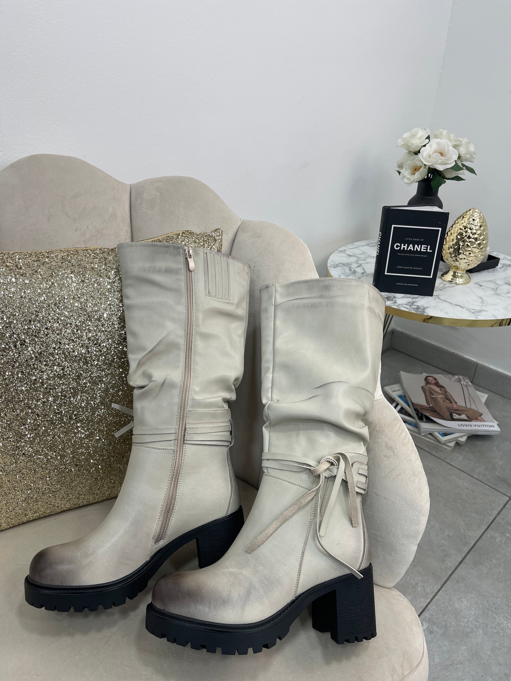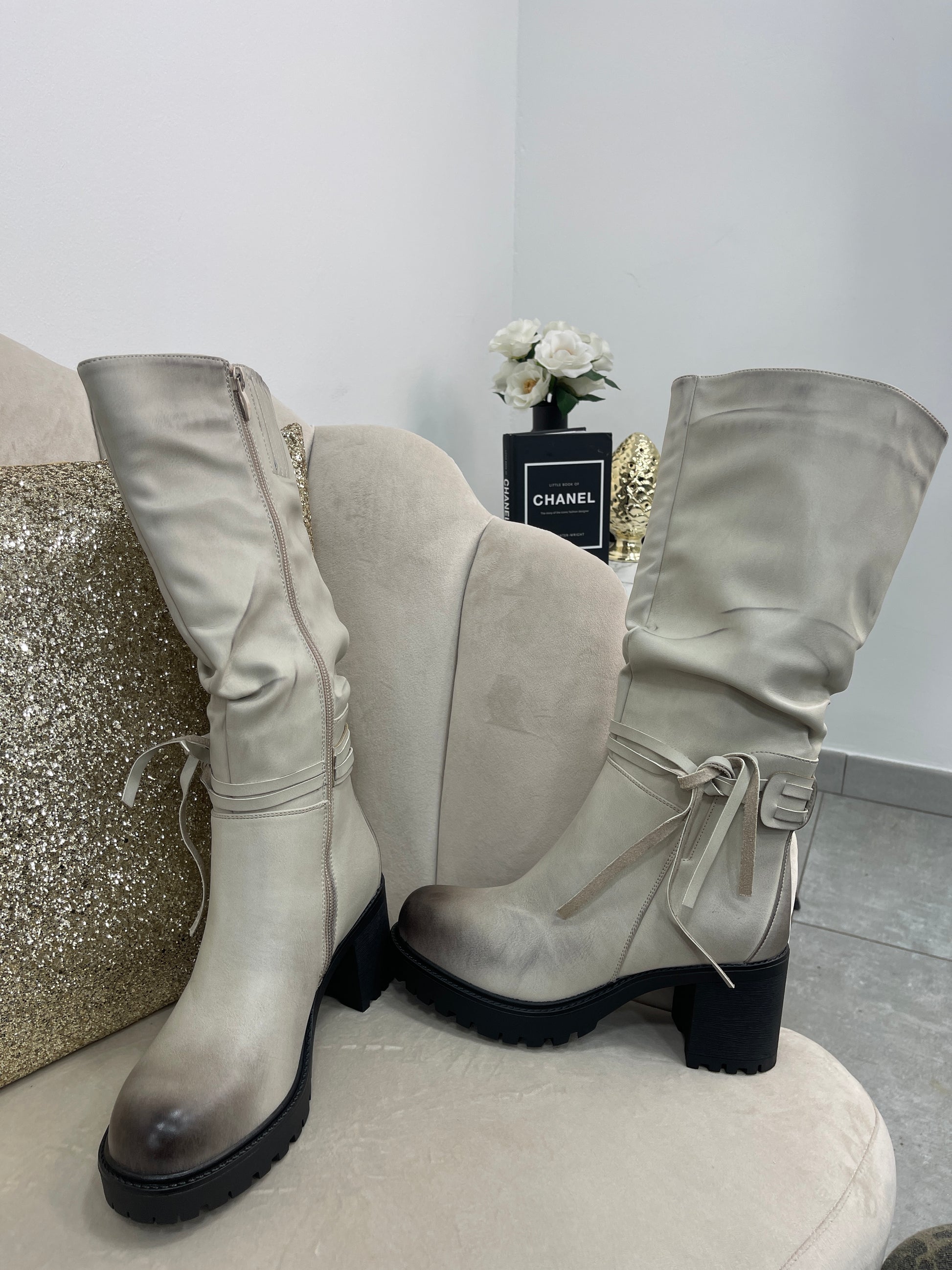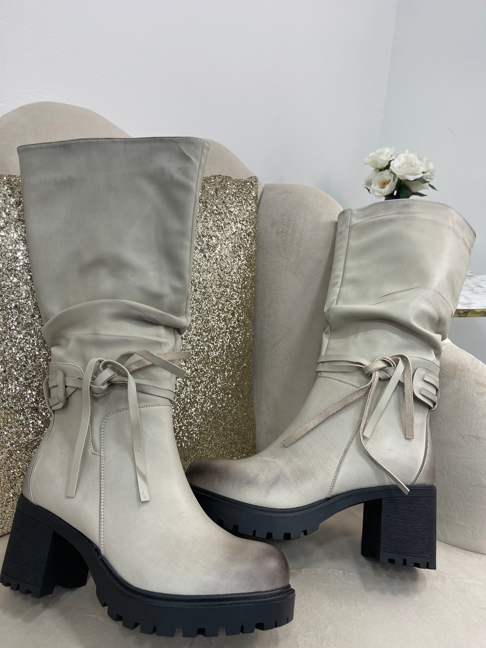 Stivaletto in ecopelle con lacci e fiocchi, zip, gambale alto e tronchetto.