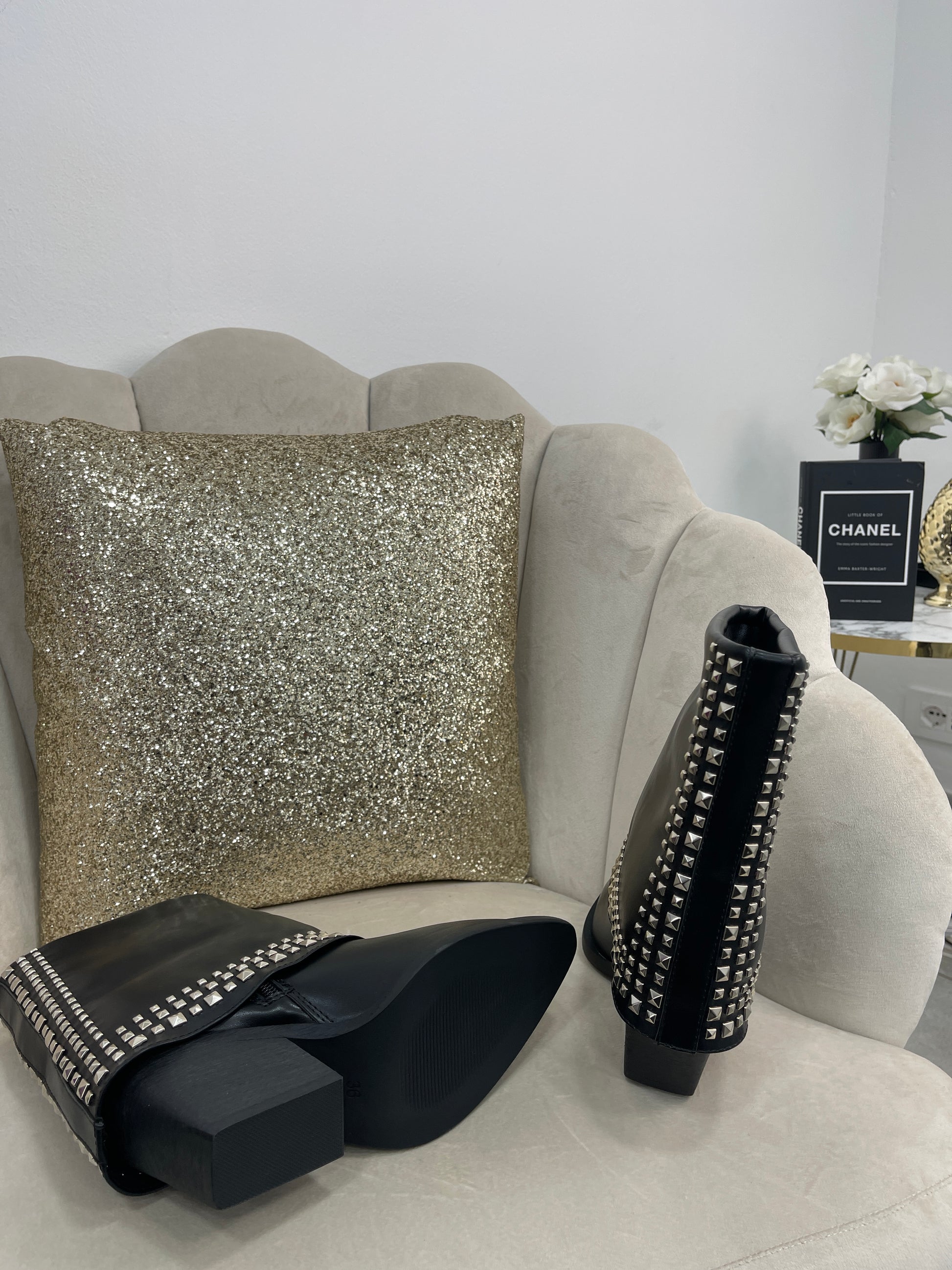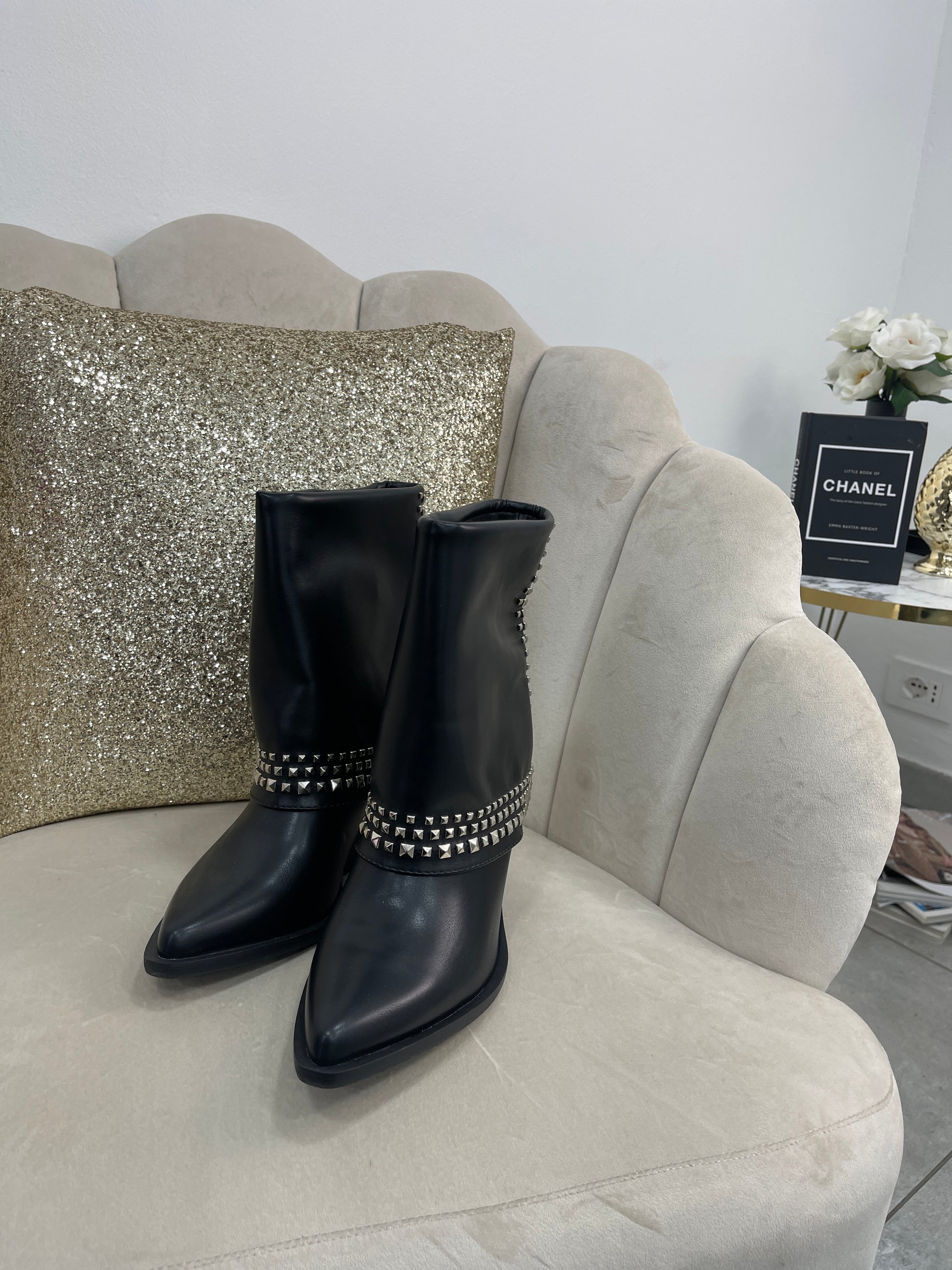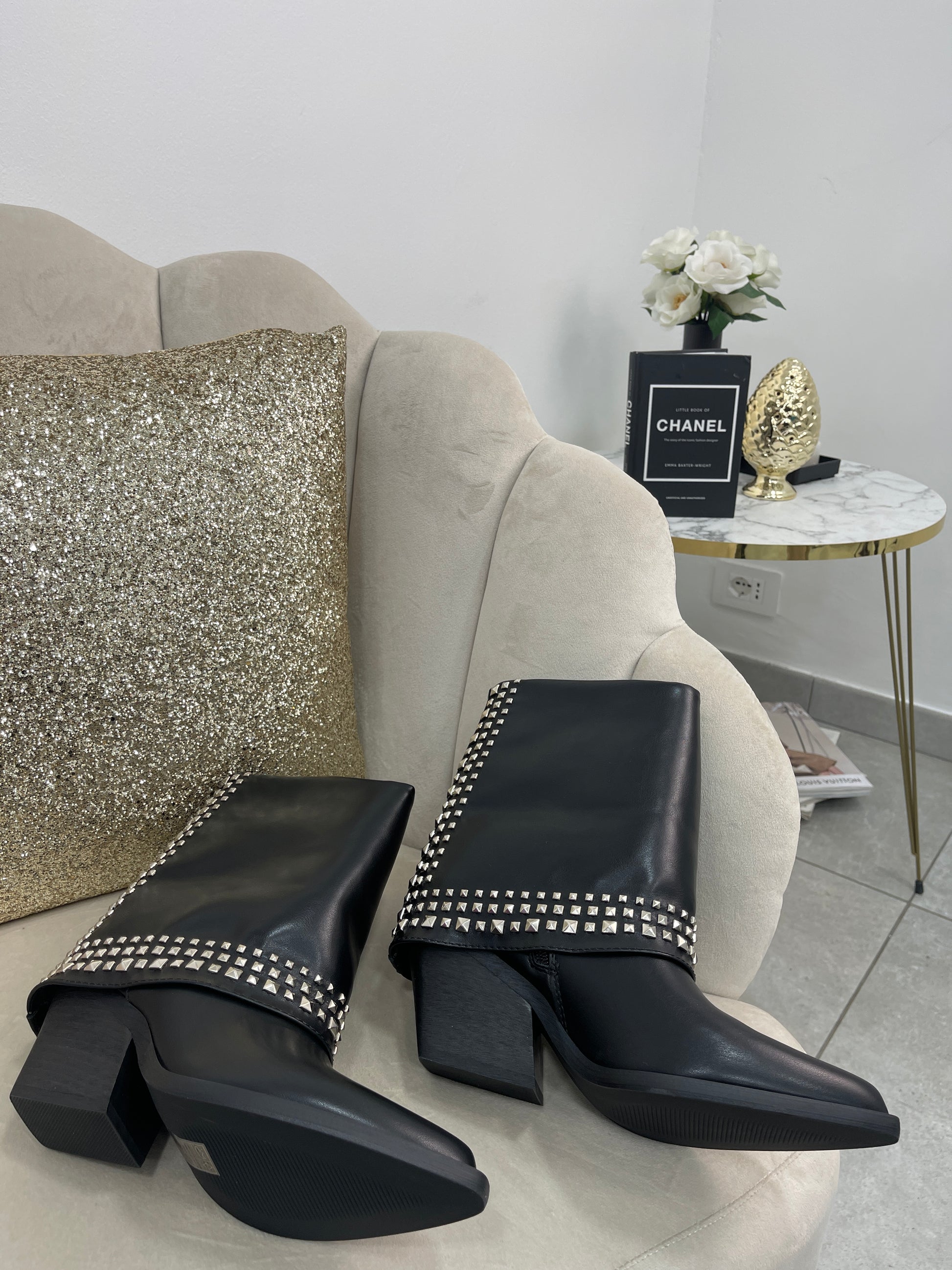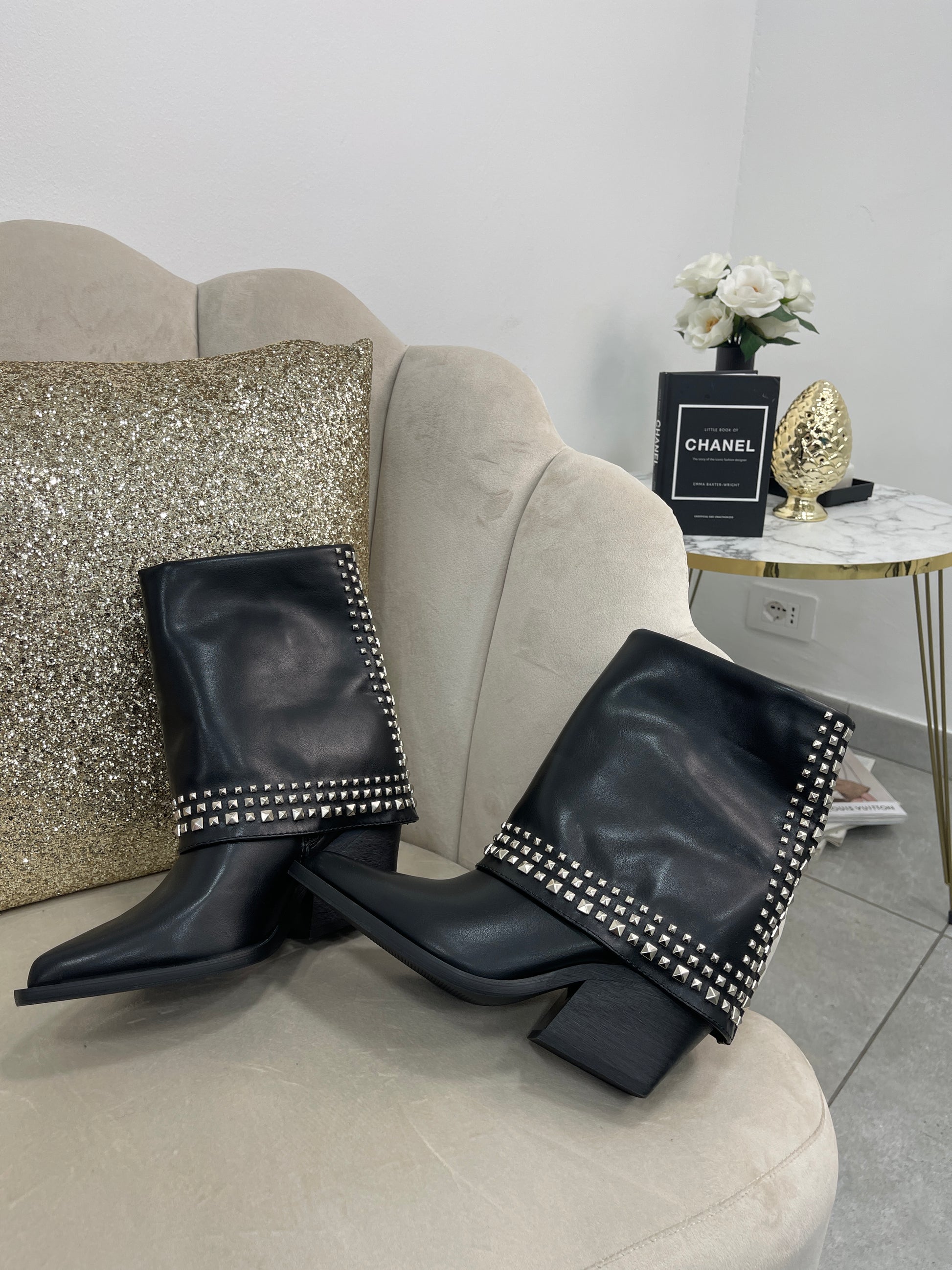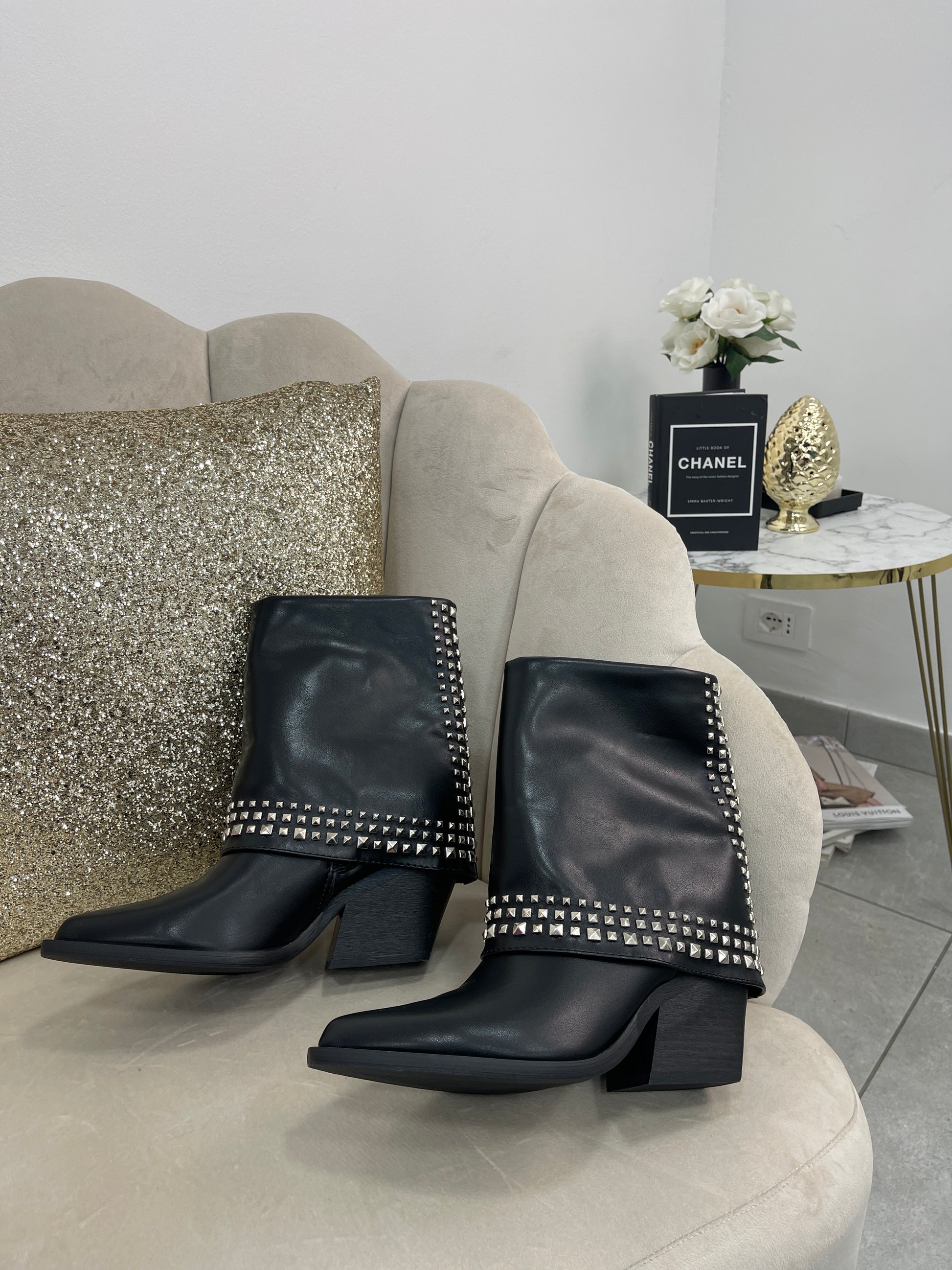 Stivaletto con risvolto, tacco, borchie e zip interna.
